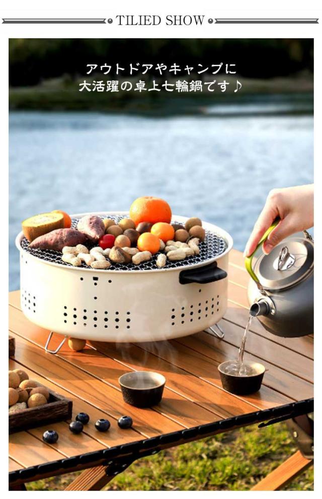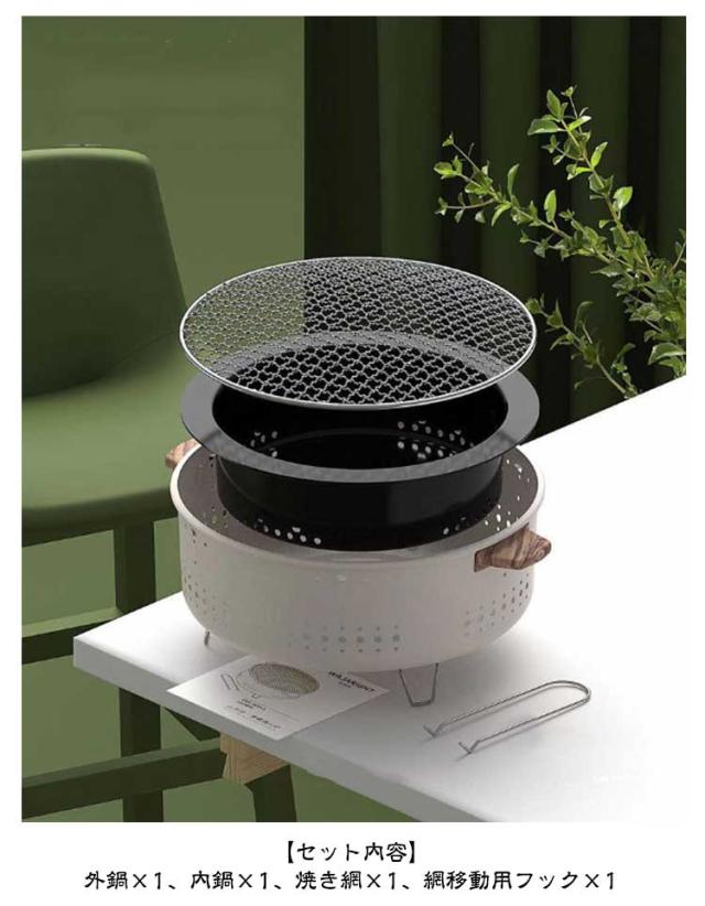 | 【卓上七輪鍋】【アウトドア・キャンプ】 【セット内容】外鍋×1、内鍋×1、焼き網×1、網移動用フック×1 アウトドアやキャンプに大活躍の卓上七輪鍋です♪ 足つきなので、底が触れないのがポイント♪ もちろん、足を折り畳んでいただいてブロックなどの上で使用しても大丈夫です。 軽量でシンプルな七輪鍋は、休日にご自宅のお庭などでコーヒーを飲んだり、食材を焼いてたべたりなど、様々な使い方ができます。 素敵なひとときをお過ごしください♪ ※煙などを吸い込むと大変危険です。室内での使用はお控えください。 | |