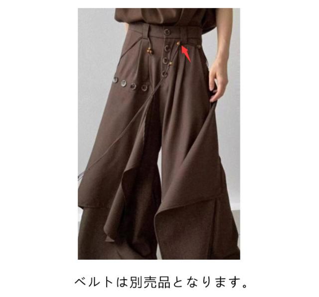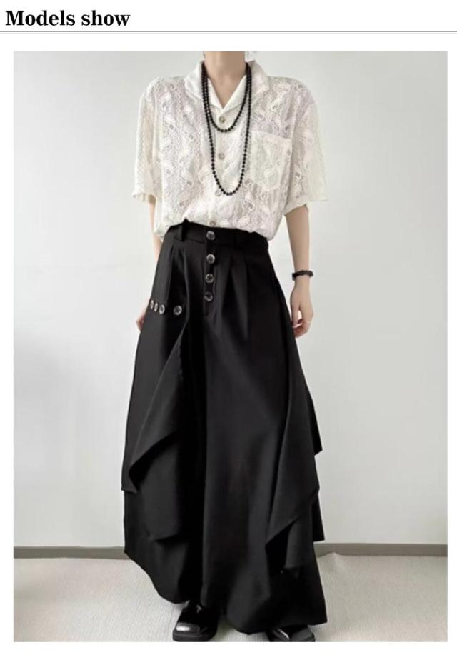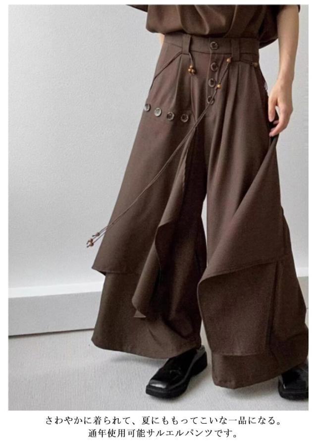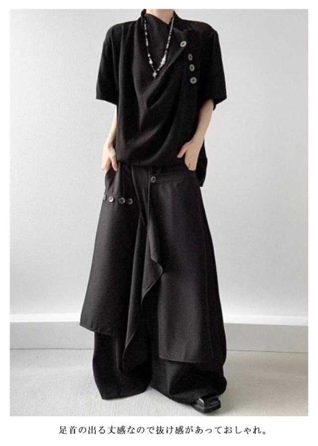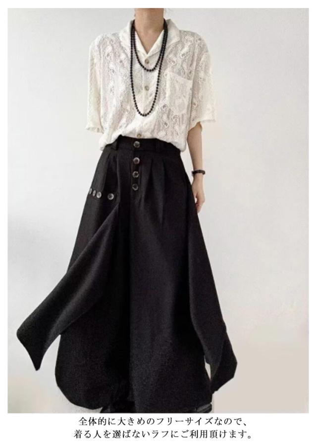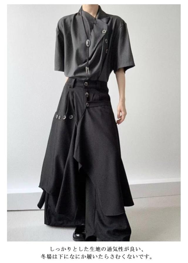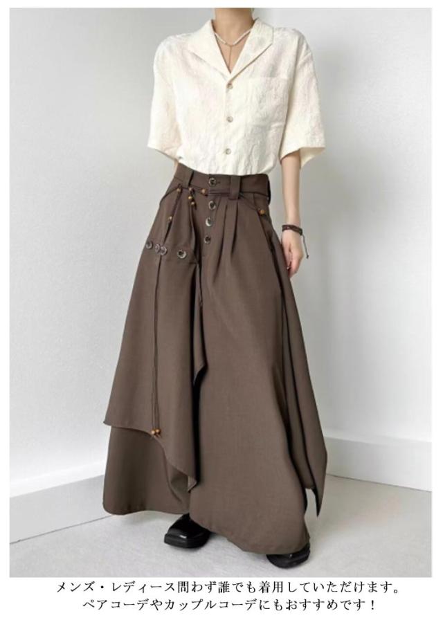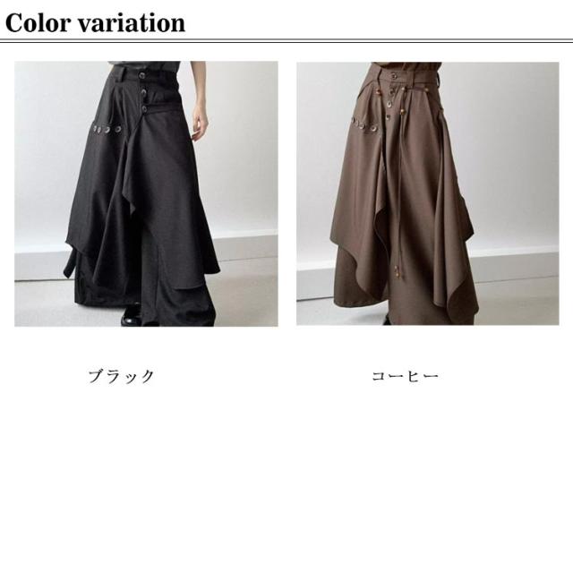 ワイドパンツ レディース メンズ ボトムス レイヤード スカートパンツ 袴パンツ ガウチョパンツ ベルトなし サルエルパンツ ゆったり 無地 黒 変形 アシンメトリー v系 原宿系 個性的 モード ストリート イージーパンツ スカンツ ガウチョ 春 夏 秋