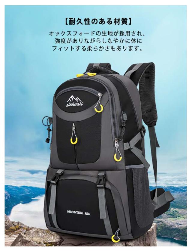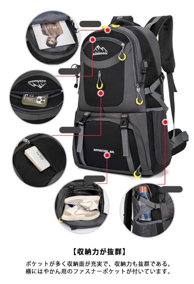 | 40L/60L 超大容量リュック 【収納力が抜群】:ポケットが多く収納面が充実で、収納力も抜群である。横にはやかん用のファスナーポケットが付いています。効率よく収納の使い分けが便利なマルチファンクションのルーム構造である。大容量、マルチポケットデザイン、メインバッグは広々としていて、簡単に配置でき、広く開くことができます。 【耐久性のある材質】オックスフォードの生地が採用され、強度がありながらしなやかに体にフィットする柔らかさもあります。引っ張りや摩擦に強い、伸び縮みがなく、高い耐久性を実現しました。軽便で、拡張性があります。 【人体工学なデザイン】登山用リュックは人間工学に基づいた快適さと安定性、通気性も考えた構造です。長時間背負っても苦にならないように。肩部・背中部は通気性のよいスポンジ素材を使用し、快適な背負い心地です。背中部で使用されているスポンジと人体の隙間を形成し、空気が通り抜けやすいです。真夏でも蒸し暑く感じません。快適なシステム、通気性のあるショルダーストラップとウエストパンドで簡単にショルダーストラップを調整することができ、肩と腰への圧力を和らげます。 【幅広く活躍】優れた機能性を持つリュックサックで、通学通勤などの日常使いから旅行や登山、トレッキング、キャン プ、ハイキング、自転車、釣り、海水浴、サマースポーツなどのアウトドアまで幅広く活用できます。更に、防災、避難 など非常用の着替え、非常食、寝袋やマットなどもこれ一つで準備できます | |