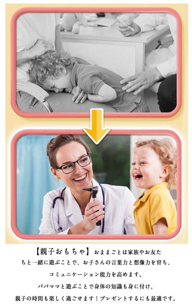 | 【素材】高品質なプラスチックを採用し、細かい部分までしっかりで安全!繰り返しに使っても簡単に壊れません。可動部分も多く、指先の訓練にもなります。適度な重さでリアル感あり、豊富な品備えで長く遊べられるでしょう。 【華セット&収納ケース付き】32点の豪華ままごとセット。聴診器・口腔鏡・温度計・点滴・注射器・メスなど、お医者さん実際に使用する道具が数多く備えております。更に収納ケース付き、遊んた後バラバラのおもちゃを収納することでお子さんの整理意識も養えるでしょう。持出も便利! 【光る響く】一部のおもちゃに音と光が搭載!聴診器をあてると心臓の鼓動の音を真似し、口腔鏡は光って口中を照らしたり、体温計も温度の数字が照らし、光る検査おもちゃでリアル感を増します! 【病院への恐れを克服】おままごとでお医者さんや看護師さんを演じ、看病や注射を真似して、ごっこ遊びの中に実際の病院への恐れもどんどん減るでしょう。更に歯医者さん道具を通じて普段歯磨きで歯をきれいにする意識も育ち、いい生活習慣も身に付けることで、身体の健康保ちに役たちます! 【親子おもちゃ】おままごとは家族やお友たちと一緒に遊ぶことで、お子さんの言葉力と想像力を育ち、コミュニケーション能力を高めます。パパママと遊ぶことで身体の知識も身に付け、親子の時間も楽しく過ごせます!プレゼントするにも最適です。 | |