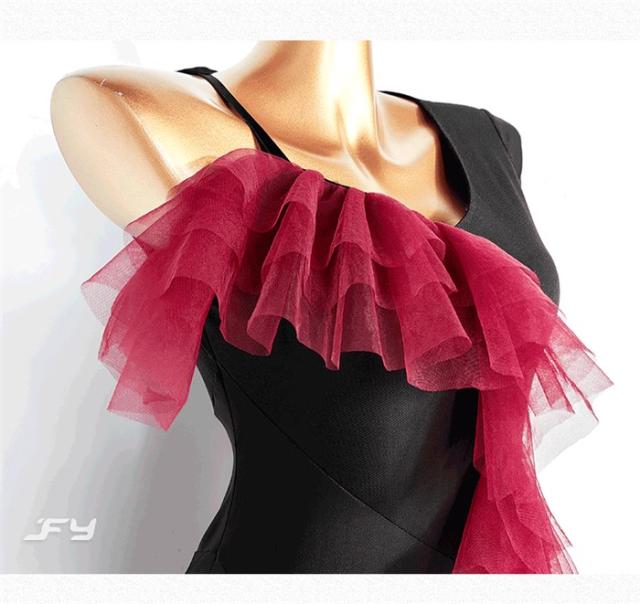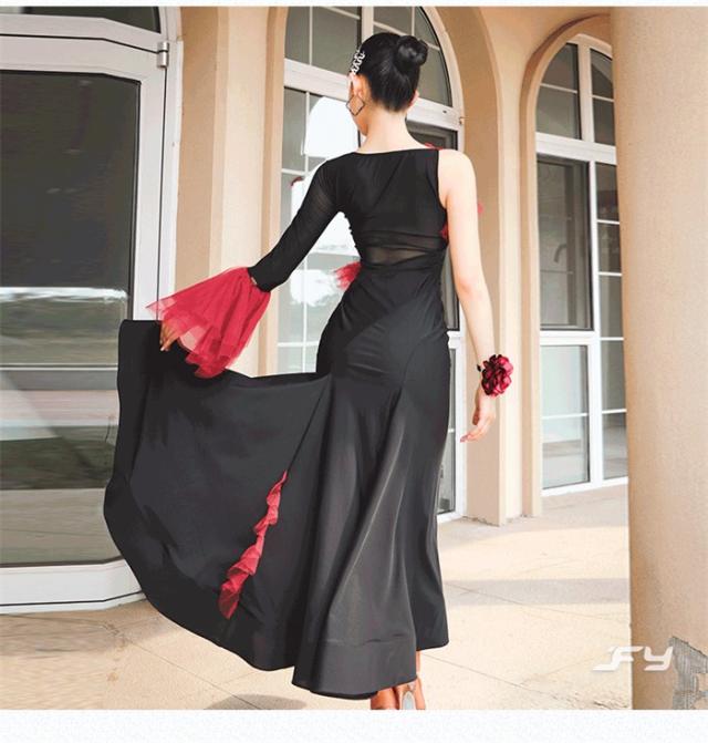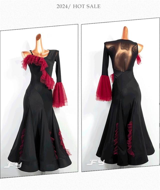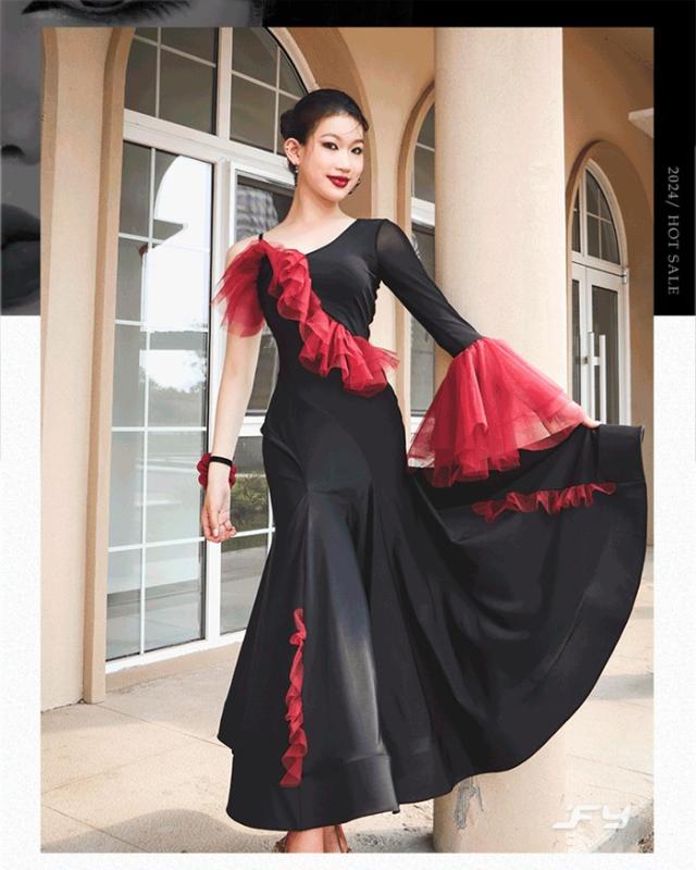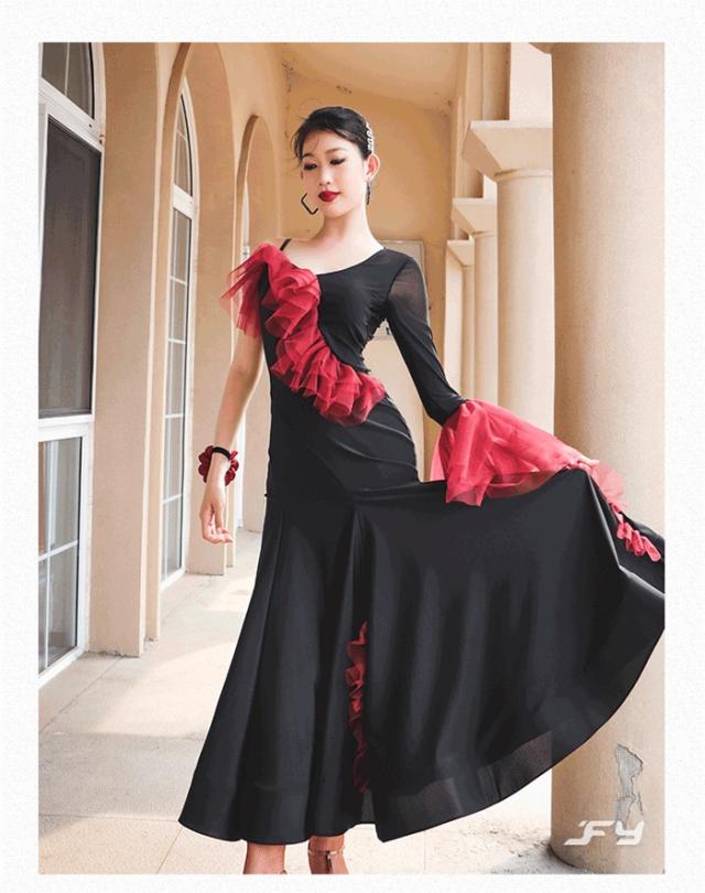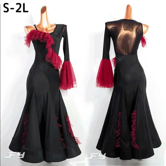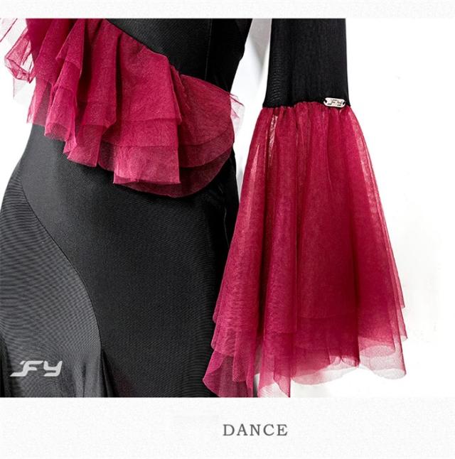 社交ダンスドレス モダンドレス 黒 赤 社交ダンス衣装 社交ダンス ドレス 衣装 長袖 大きい裾 スタンダードドレス ワルツダンス ワンピースドレス ステージ衣装 競技会 パーティー 発表会 競技着 練習着 舞台 演奏会 演出 ブラック ワインレッド d1326d7d7lc