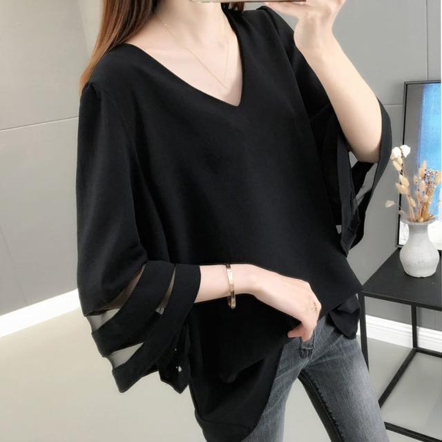 襟周りはデコルテが綺麗に見えるVネックのシャツブラウス。