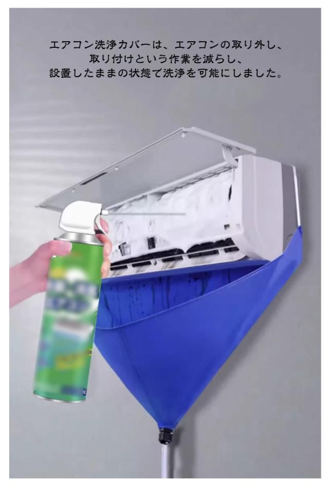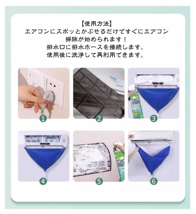 | 【エアコン洗浄カバー】【6点セット】 エアコン洗浄カバーは、エアコンの取り外し、取り付けという作業を減らし、設置したままの状態で洗浄を可能にしました。 ベルトでしっかり固定できるので、カバーが落下する心配はありません。 大きな開口部なので、洗浄作業がスムーズに行えます。 下に溜まった水は、排水ホースを通して排水出来ます。 しかも丈夫な素材なので繰り返し何度でも使え、とても経済的です! 【使用方法】 エアコンにスポッとかぶせるだけですぐにエアコン掃除が始められます! 排水口に排水ホースを接続します。 使用後に洗浄して再利用できます。 | |