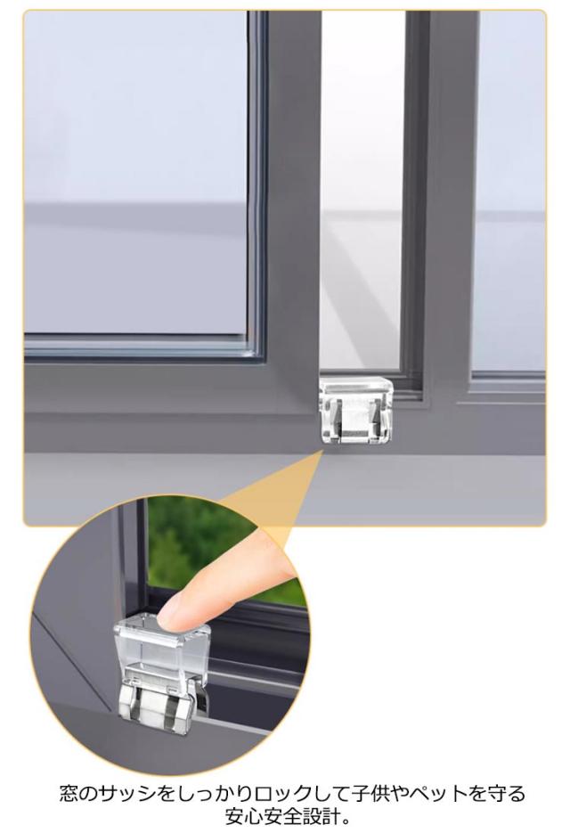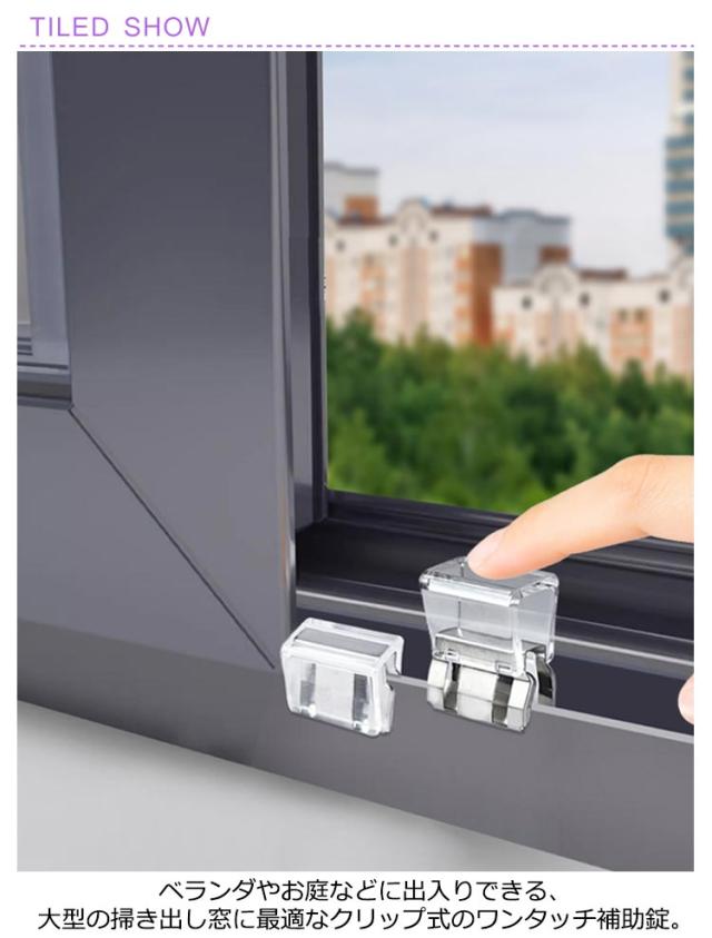 | サッシの上部にも設置、大きなベランダ窓やサッシに付ける補助錠。22個セット ベランダやお庭などに出入りできる、大型の掃き出し窓に最適なクリップ式のワンタッチ補助錠。 窓のサッシをしっかりロックして子供やペットを守る安心安全設計。 カギの開け閉めを覚えたばかりの小さなお子様のイタズラ対策や勝手に窓のカギを開けてしまう危険も防止。 取り付けは簡単で、換気しながらでもロックが可能です。 | |