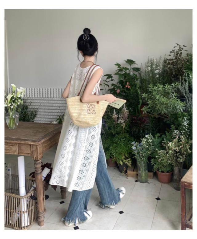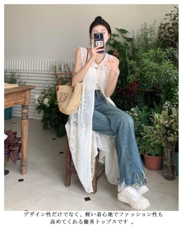 | いつものコーデにプラスするだけでこなれる一枚ロングベスト。 爽やかで繊細な透かし編みニットが季節感のある装いに仕上げてくれます。 前後でこなる表情を楽しめる2way仕様で、その日の気分に合わせられる一枚です。 縦ラインを強調しながら、体型のラインを隠して、着痩せ効果抜群! デザイン性だけでなく、軽い着心地でファッション性も高めてくれる優秀トップスです 。 | |