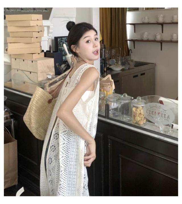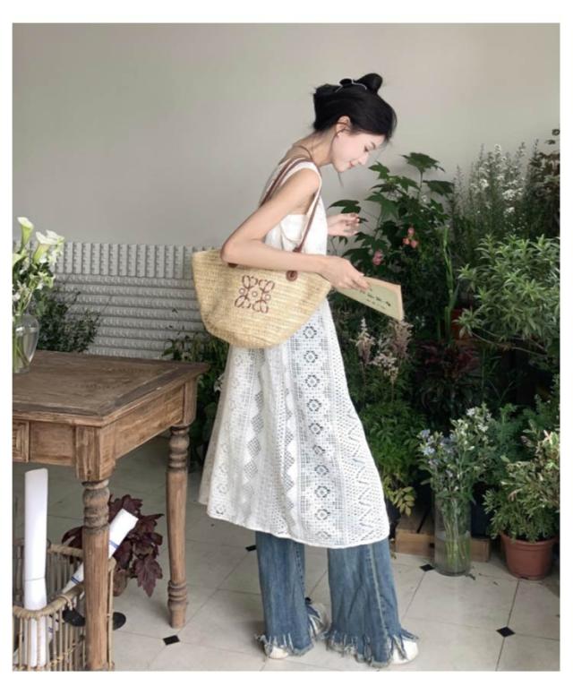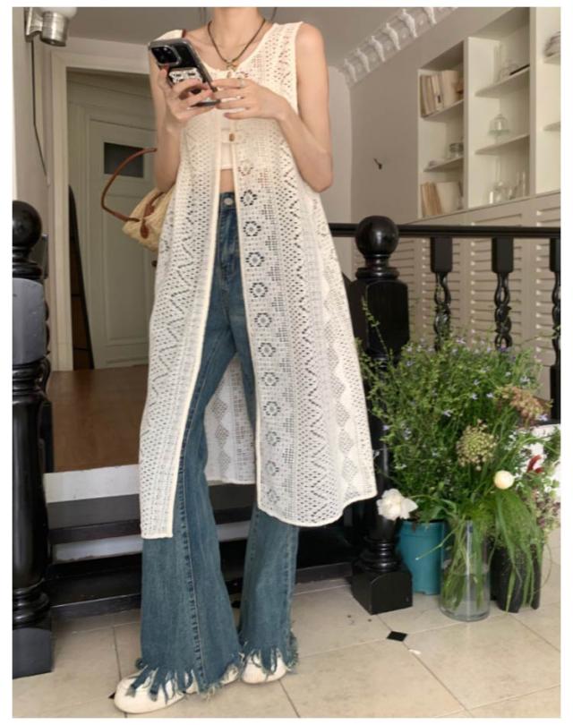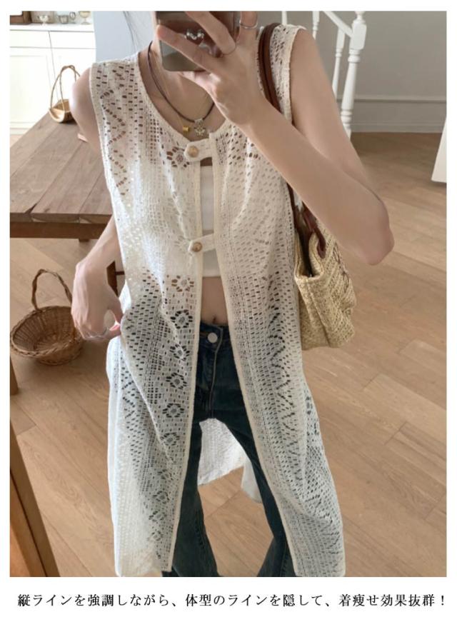 | いつものコーデにプラスするだけでこなれる一枚ロングベスト。 爽やかで繊細な透かし編みニットが季節感のある装いに仕上げてくれます。 前後でこなる表情を楽しめる2way仕様で、その日の気分に合わせられる一枚です。 縦ラインを強調しながら、体型のラインを隠して、着痩せ効果抜群! デザイン性だけでなく、軽い着心地でファッション性も高めてくれる優秀トップスです 。 | |