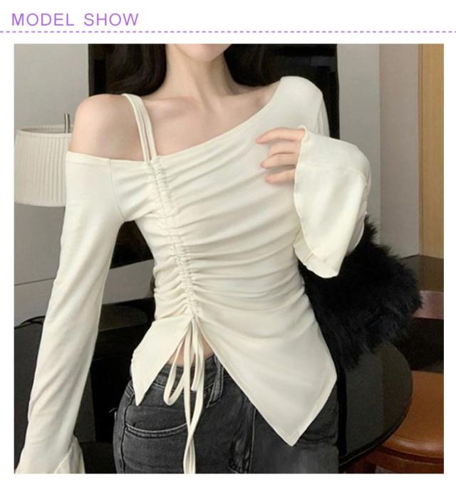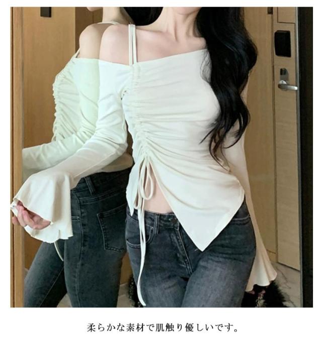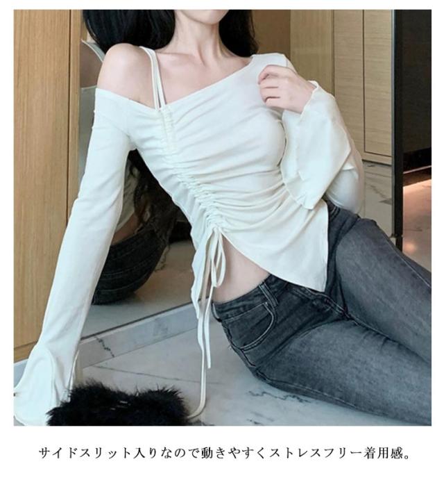 長袖tシャツ 春夏 着やせ トップス 韓国ファッション レディース 肩出し 肩出し tシャツ おしゃれ カットソー きれいめ ギャザー入り アシンメトリー サイドスリット M L