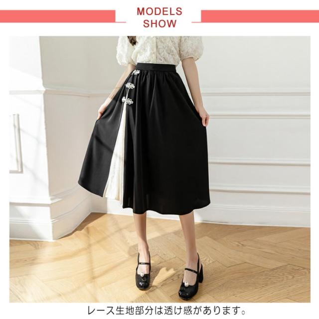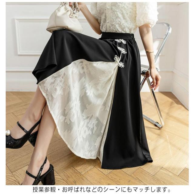 | チャイナ風デザインのロングスカート レース生地部分は透け感があります。 ウエストゴム仕様で着脱が楽ちん! 授業参観・お呼ばれなどのシーンにもマッチします。 | |
