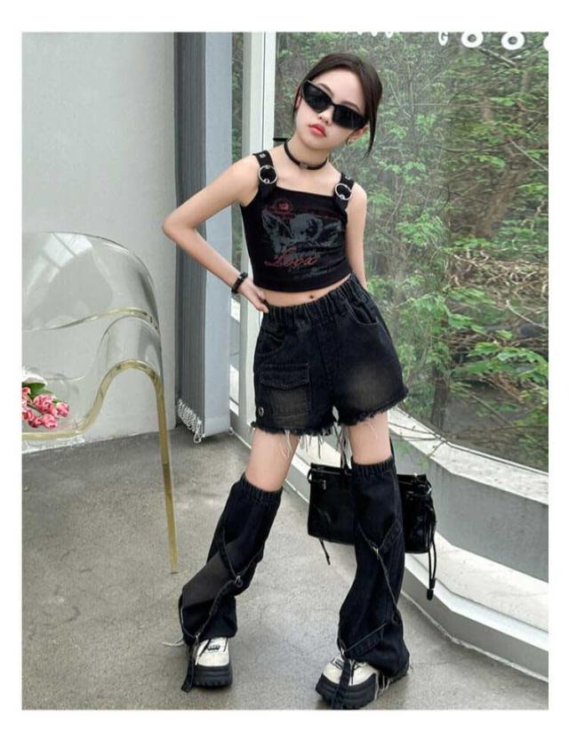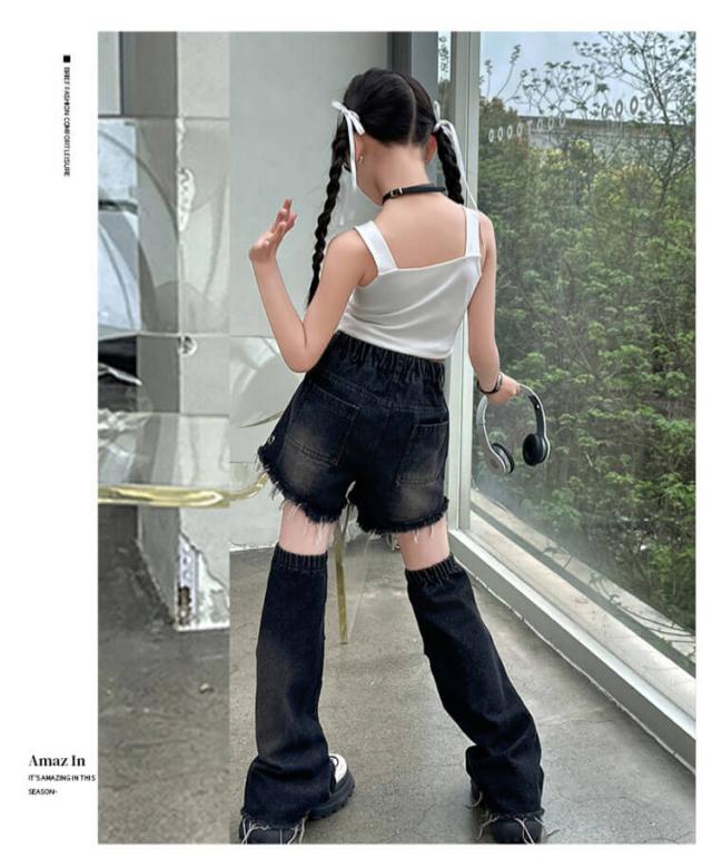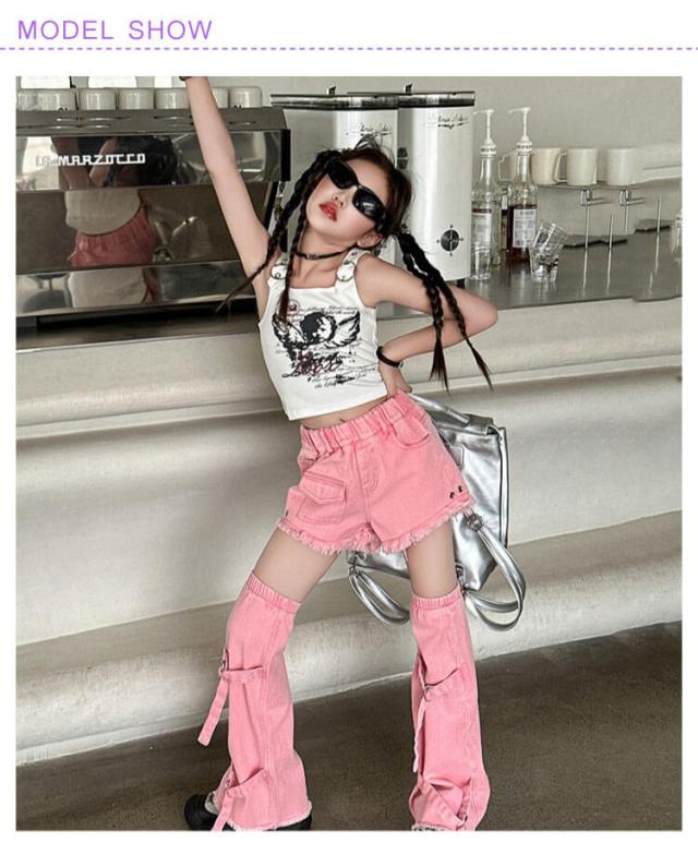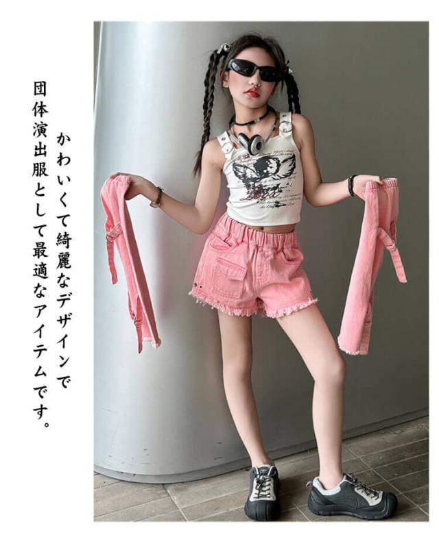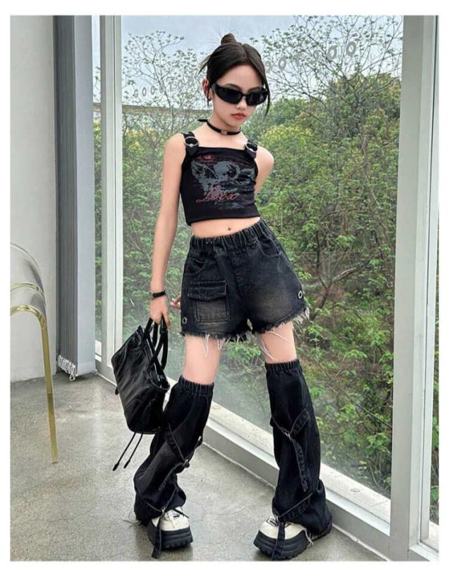 ジャズダンス 衣装 セットアップ ジャズダンス衣装 キッズ 韓国 タンクトップ デニムパンツ ゆったり 女の子 足カバー ダンス衣装 ショートパンツ シンプル 団体服 ヒップホップ ポッピング チアガール 発表会 演出服 応援団 原宿系 個性派 120-170cm