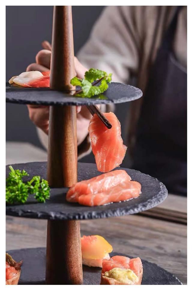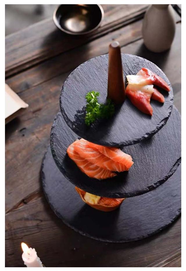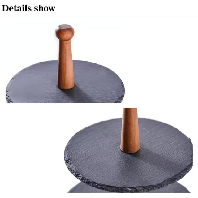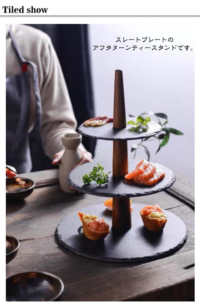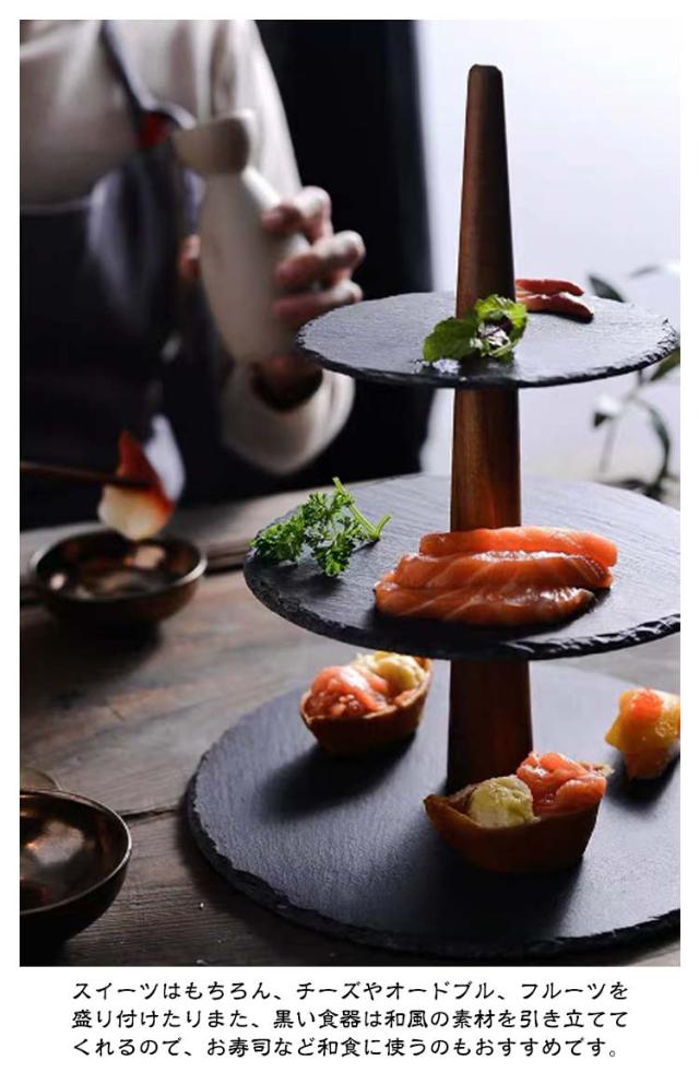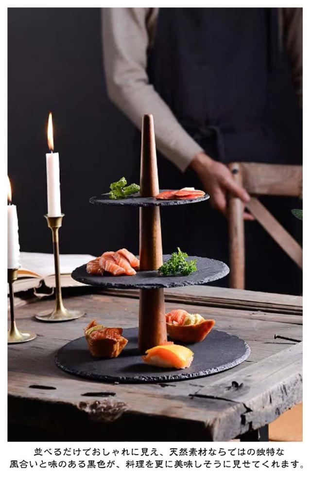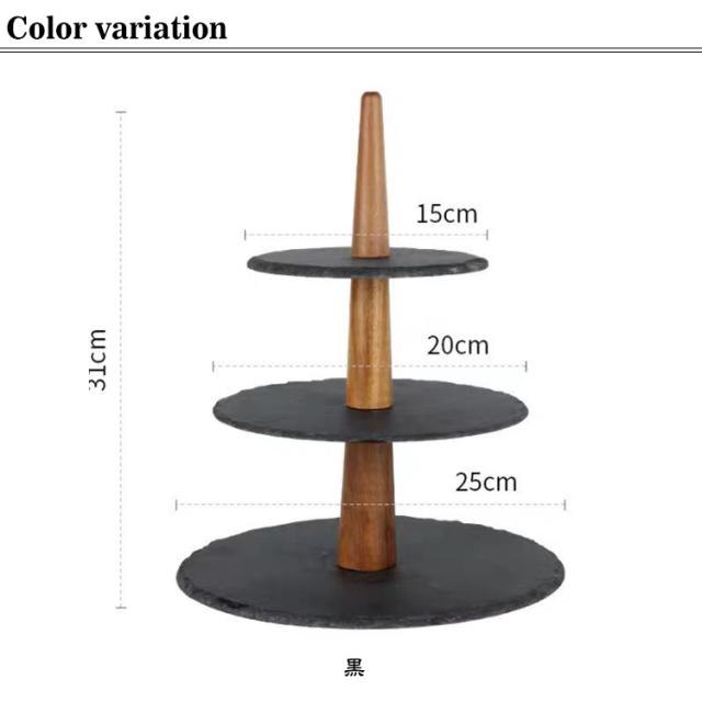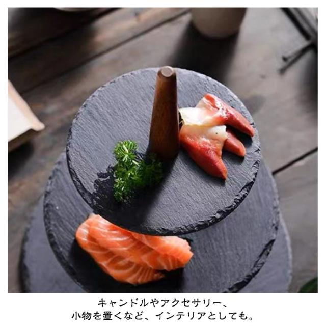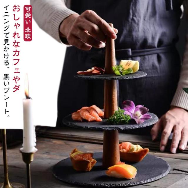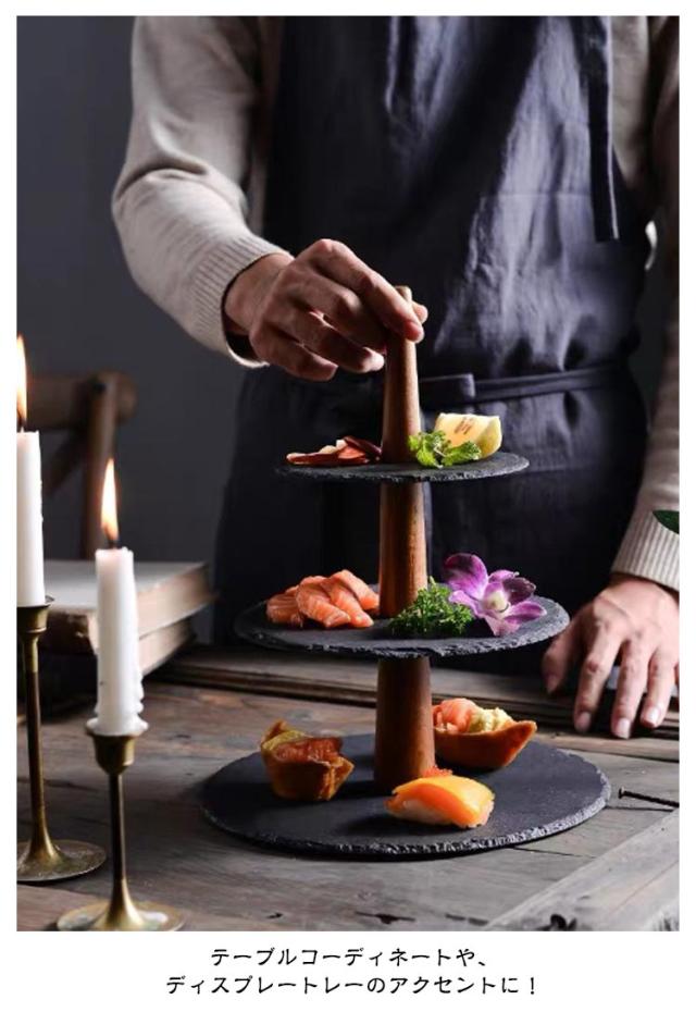 ケーキスタンド 3段 ケーキトレー 石 天然石 木製 ケーキプレート アフタヌーンティー お寿司 和食 デザート ケーキ スタンド スレート プレート ディスプレイ 黒い 食器 和モダン 可愛い 北欧 おしゃれ タワー型