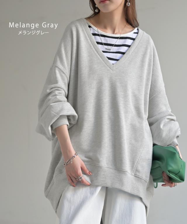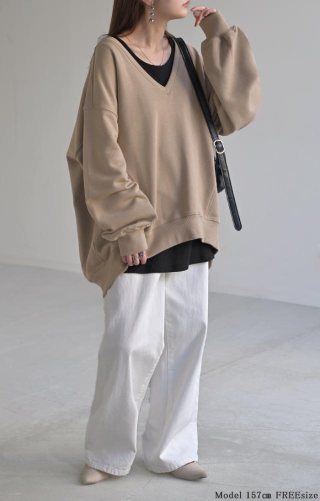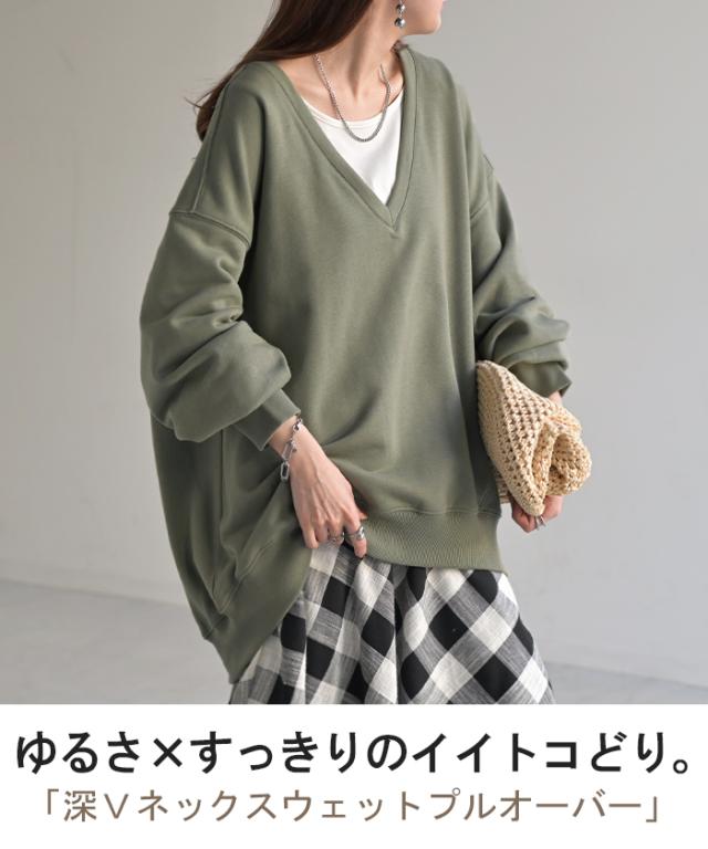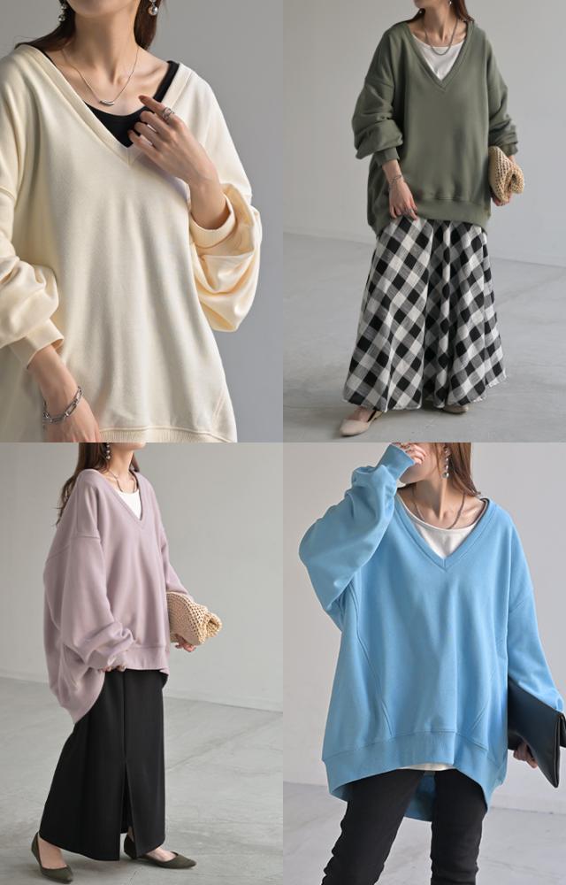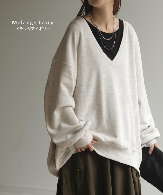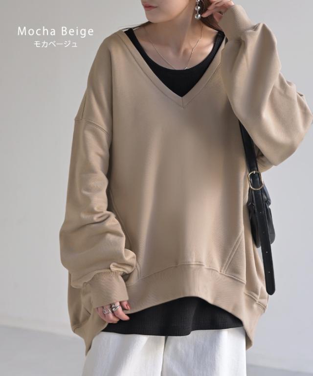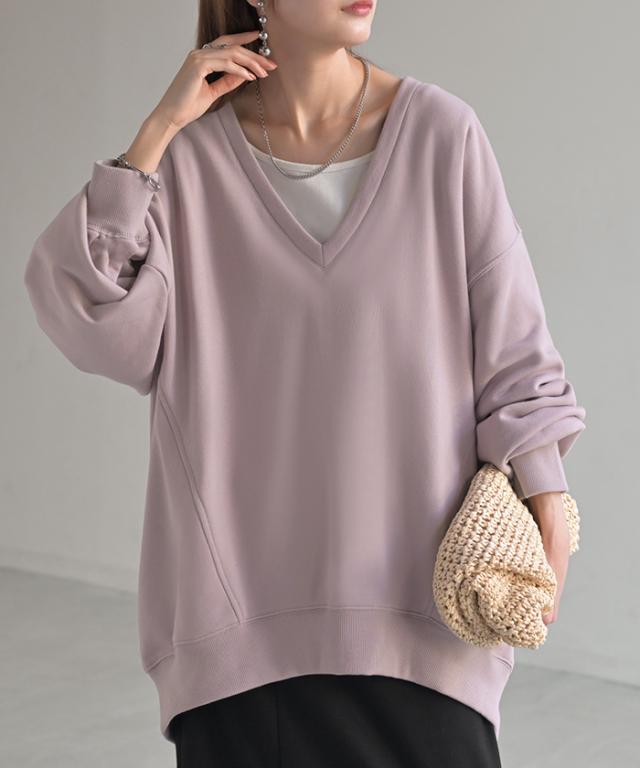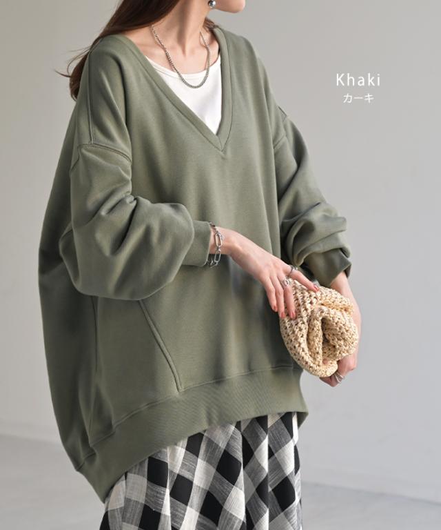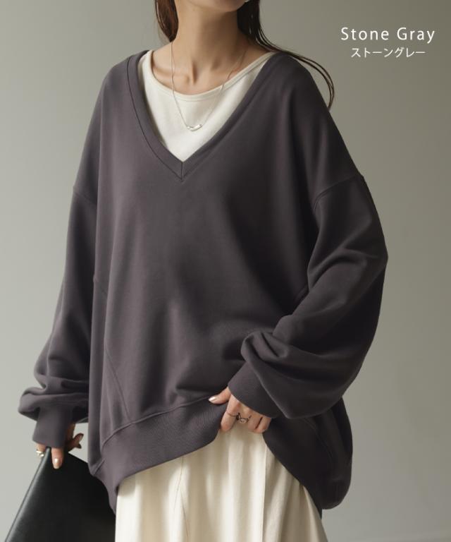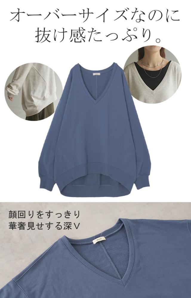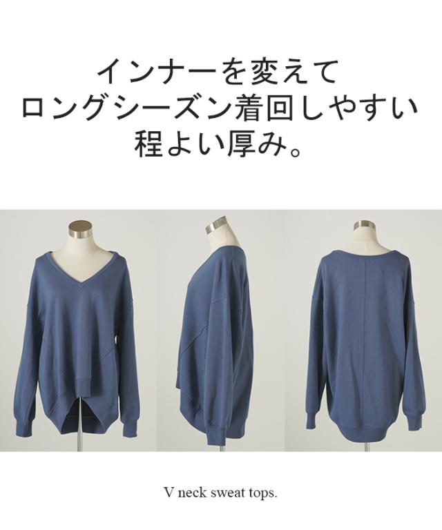 深めのVネックがレイヤード映えするスウェットトップスです。
