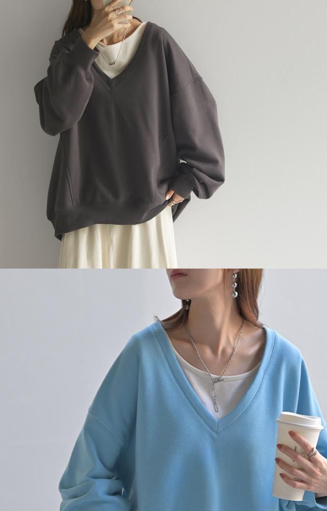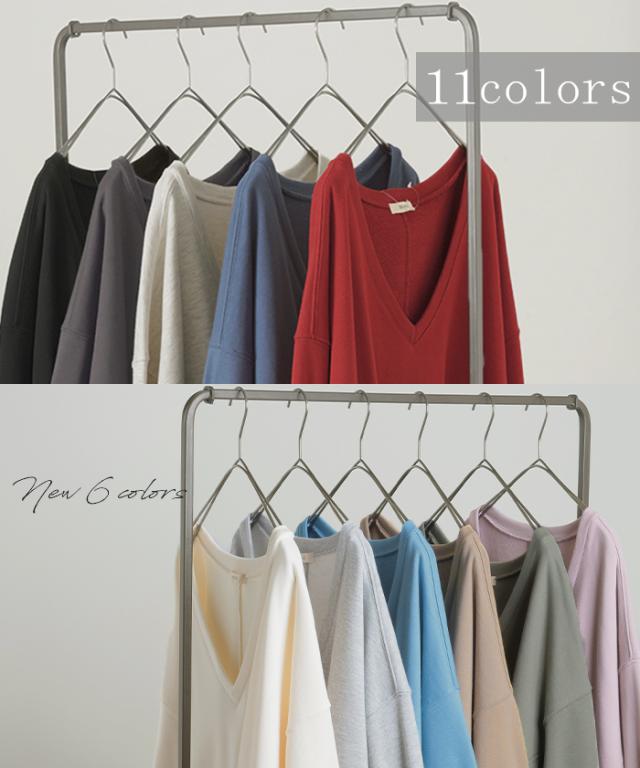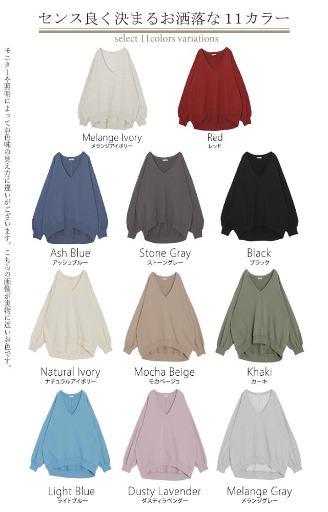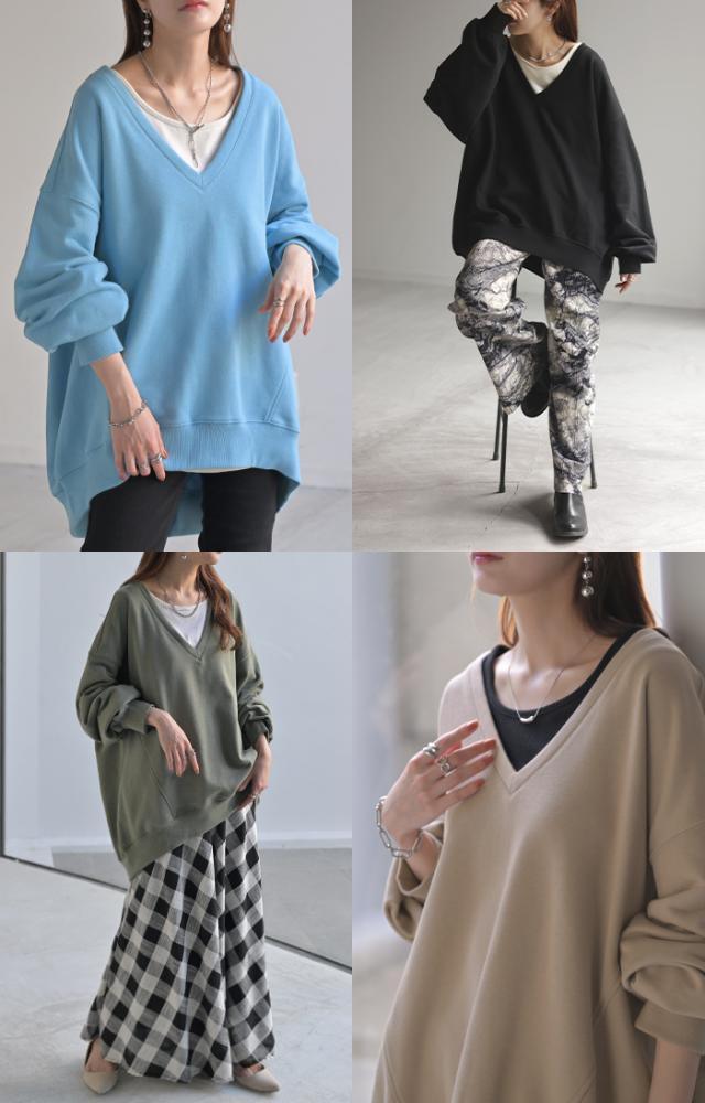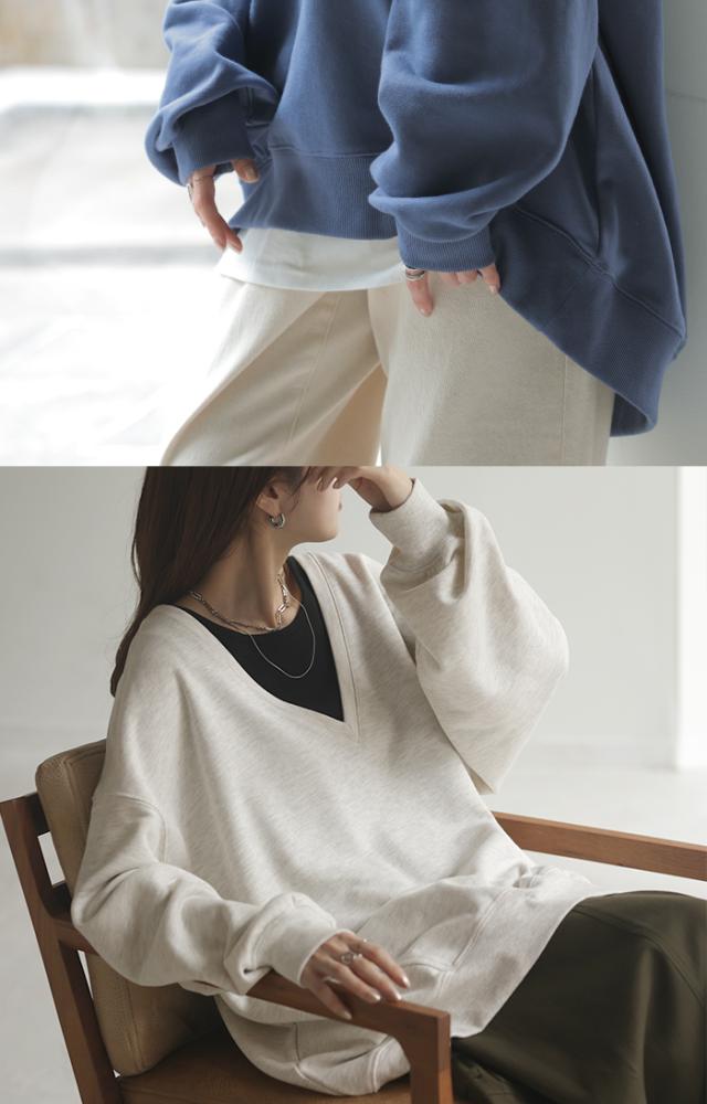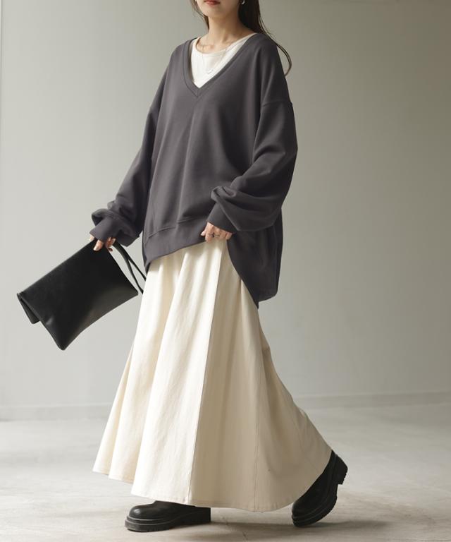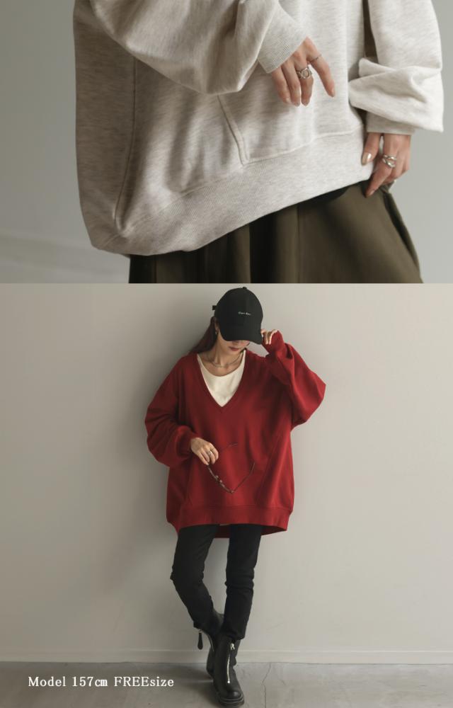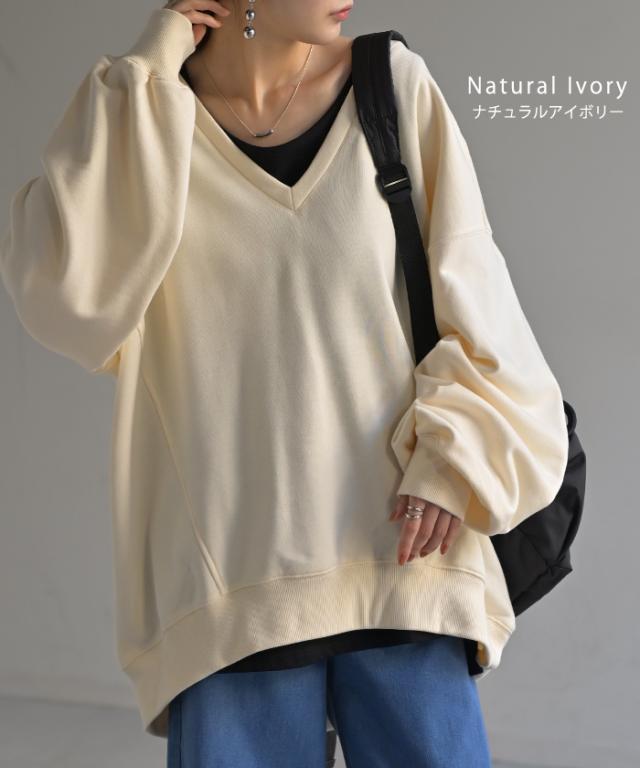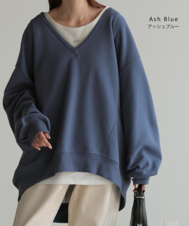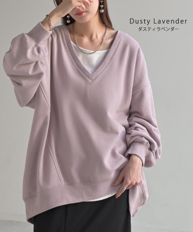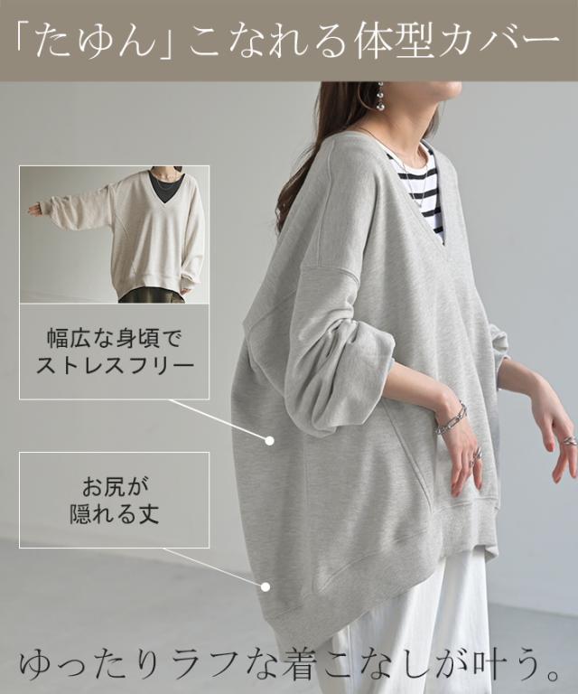 深めのVネックがレイヤード映えするスウェットトップスです。