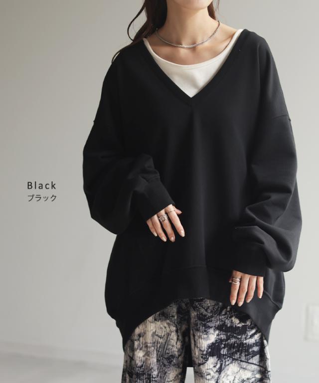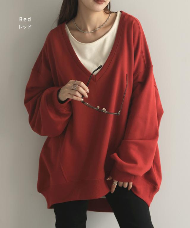 トップス 深V スウェット 体型カバー レディース トレーナー レイヤード チュニック 大きいサイズ Vネック ドロップショルダー スエット プルオーバー ビッグ 重ね ロング キーネック ゆったり オーバーサイズ お尻が隠れる 長袖 黒 赤 秋 夏 HUG.U 秋新作