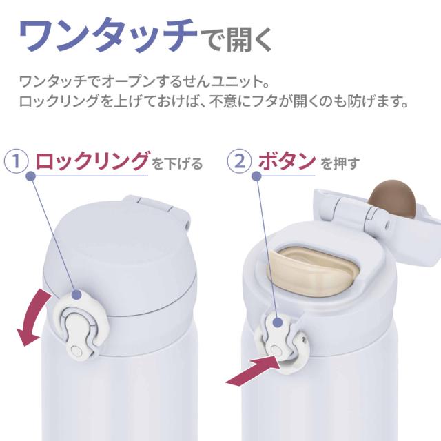 ワンタッチオープンキャップは片手で簡単ワンタッチオープン、そのまま飲めます。 ロック機能付きで、バッグの中に入れても漏れずに安心。