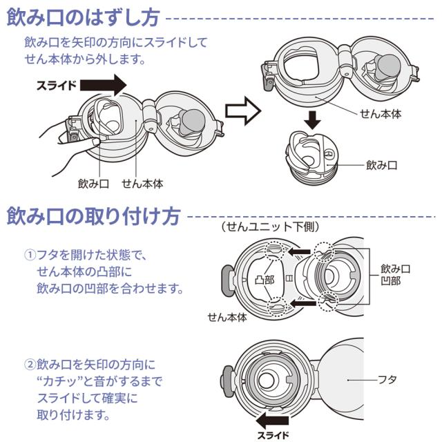 お手入れ簡単飲み口が分解できて、お手入れカンタン。「飲み口着脱ボタン」がなくなりシンプルな構造になったので、ますます洗いやすい。