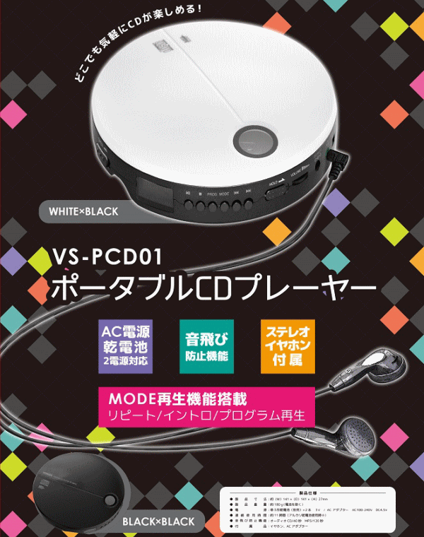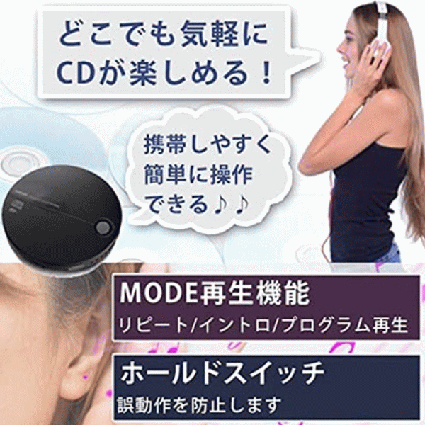 携帯しやすく簡単に操作できるポータブルCDプレーヤー。手軽に操作でき自宅や通勤・通学途中・外出先でも音楽を楽しむ事ができます。音楽を聴くだけでなく英語学習などにもオススメ。音飛び防止機能もついているので安心してお使い頂けます。2電源(AC電源、乾電池)対応、リピート、イントロ、プログラム再生機能搭載。ホールドスイッチを入れるとボタン操作を無効にして誤作動を防止します。■製品寸法約W141×D141×H27mm■製品重量約180g(電池を除く)■電源:単3形乾電池×2本(別売)3V、ACアダプター:AC100-240V DC4.5V■連続使用時間約11時間(アルカリ乾電池使用時)■音飛び防止機能:オーディオ CD/40秒、MP3/120秒■付属品:イヤホン、ACアダプター■カラー:ブラック×ブラック■生産国:中国※連続使用時間は環境により異なります。