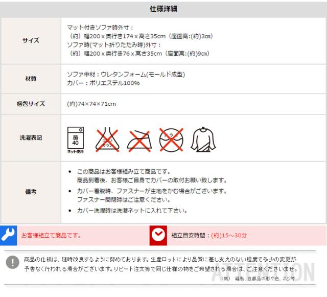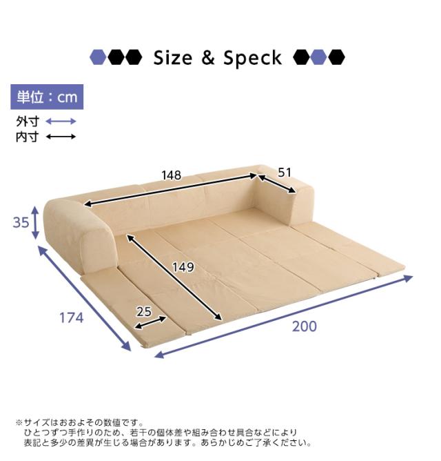 マット付きソファ時外寸:W200 x D174 x H35 x SH3cm