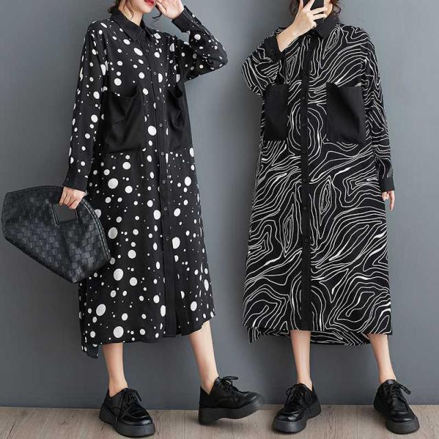 ワンピース ロング 長袖 レディース モード系 個性的 ミディアム丈 シャツ ワンピ pLegLad店 レトロ 前開き 大人女子 ゆったり 体型カバー 黒 秋 40代 30代