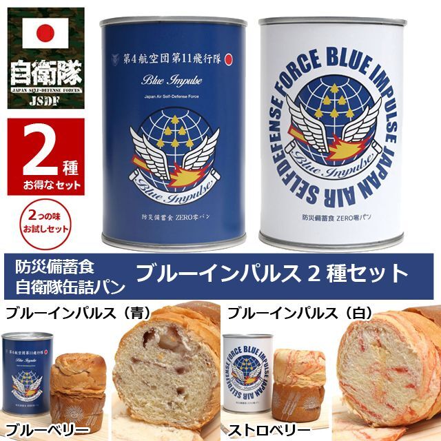 ■セット内容:防災備蓄食 自衛隊缶詰パンx2(ブルーインパルス(青)×ブルーベリー1個、ブルーインパルス(白)×ストロベリー1個)