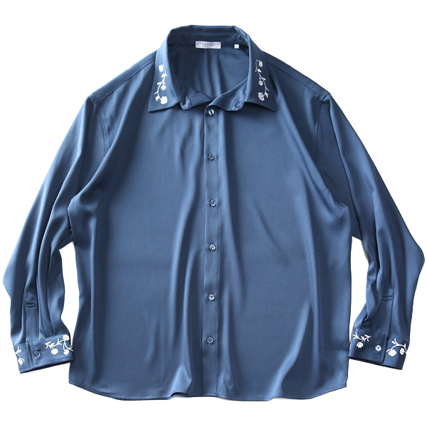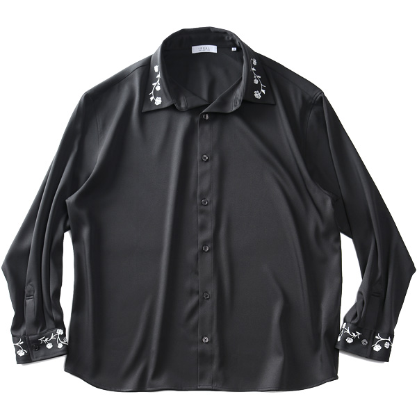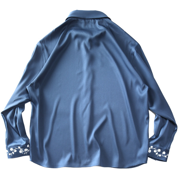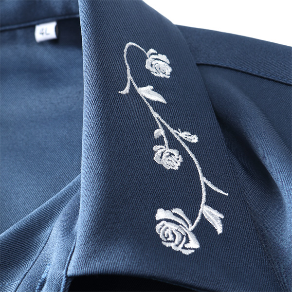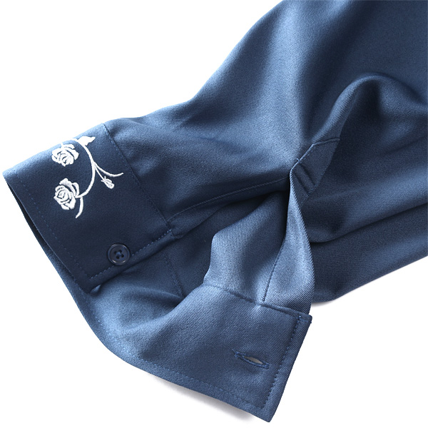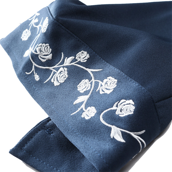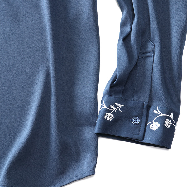 素材は、ソフトな風合いと美しい光沢感のあるツイルストレッチを採用。デザインは配色刺繍がアクセントのシャツ。衿・カフスに刺繍(バラ)でトレンド感を表現しました。