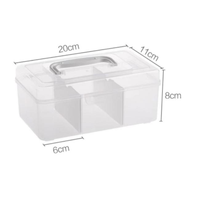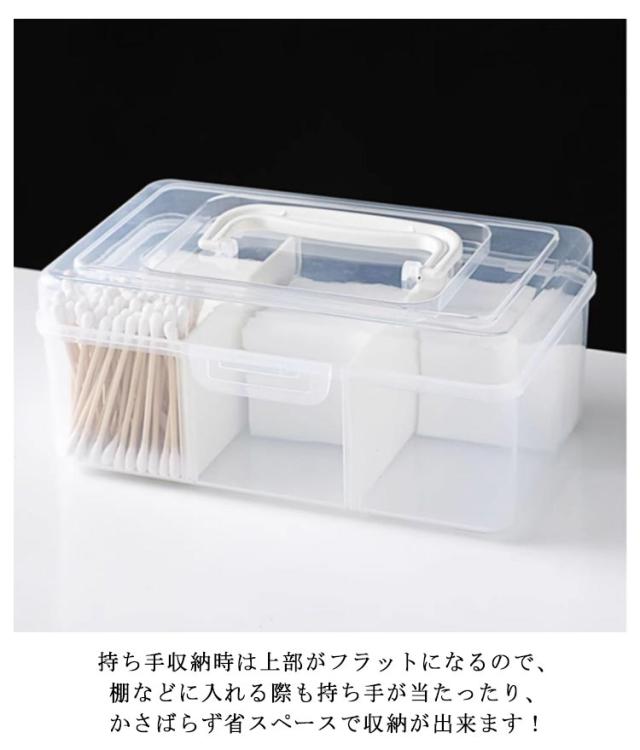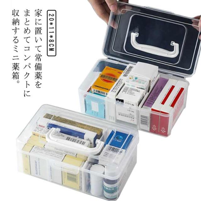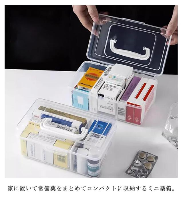 | 家に置いて常備薬をまとめてコンパクトに収納するミニ薬箱。 透明になっているので、中身が一目瞭然です! スクエアタイプなので、小さくて持ち運びやすいです。 仕切りがあり、綿棒、感冒薬などの常備薬も分類して収納可能です。 小ぶりなのに収納力抜群!薬箱だけでなく、化粧品や文房具も収納できます。 持ち手収納時は上部がフラットになるので、棚などに入れる際も持ち手が当たったり、かさばらず省スペースで収納が出来ます! すぐに取り出して使いたい物や、救急箱や衛生用品の収納にオススメです。 | |