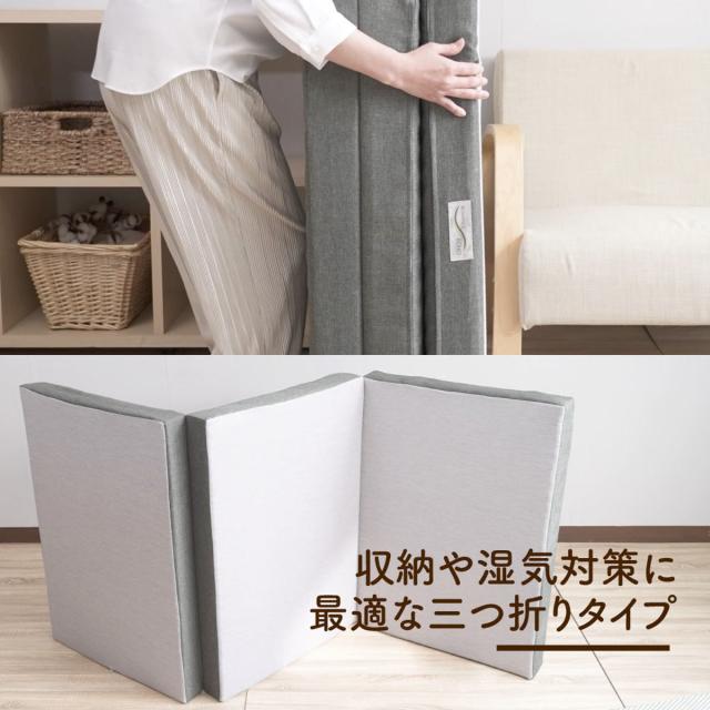 コンパクトに折りたためる三つ折りタイプです。折りたたむとコンパクトになるので移動や収納もしやすく、立てて干せるので湿気対策にもなります。