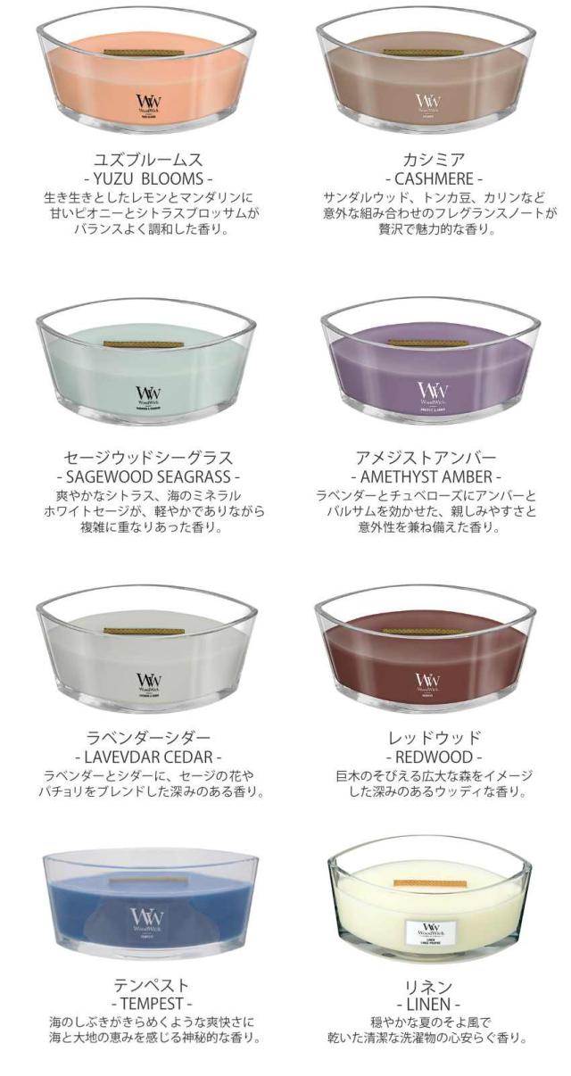 | 種類 | ラベンダースパ、ホワイトティー&ジャスミン、コースタルサンセット、イブニングバンファイア、バニラシーソルト、ホワイトチーク、ウォームウール、マグノリアバーチ、ユズブルームズ、カシミヤ、セージウッドシーグラス、アメジストアンバー、ラベンダーシダー、レッドウッド、テンペスト、リネン |