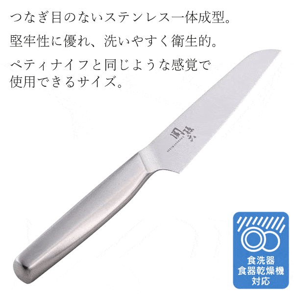 | 堅牢、清潔に使えるオールステンレス製。 収納や持ち運びに便利な樹脂製のサヤ付き。 |