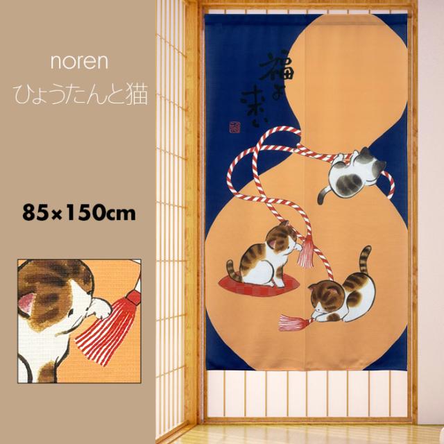 のれん 暖簾 おしゃれ カーテン 間仕切り 仕切りカーテン 目隠し 和風 和柄 和モダン 和風モダン 和風暖簾 日本 ひょうたん 瓢箪 ねこ 三毛猫 縁起 風水 ひょうたんと猫 85×150cm
