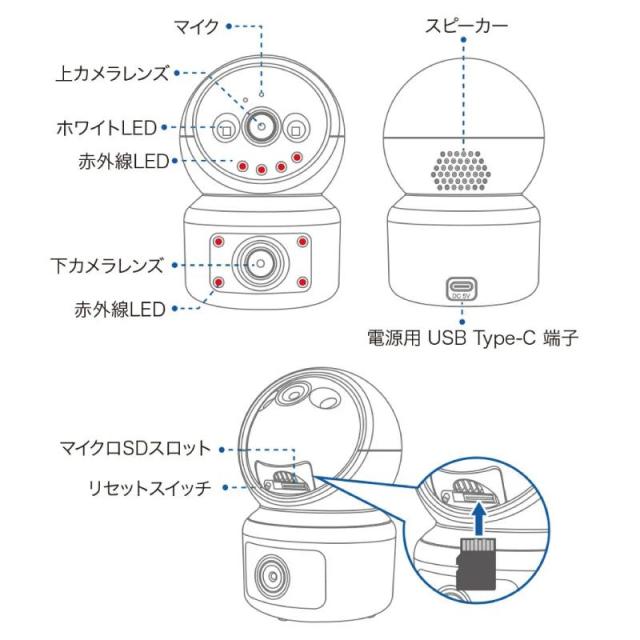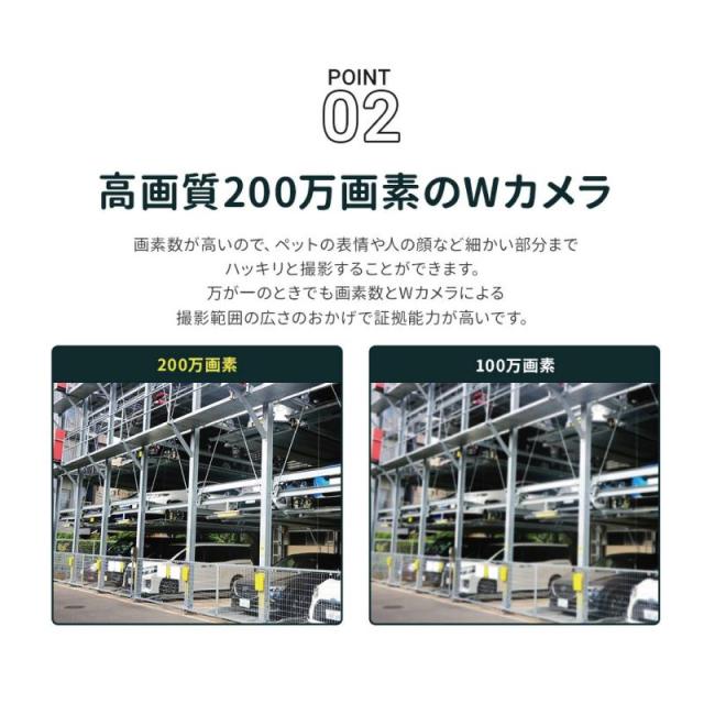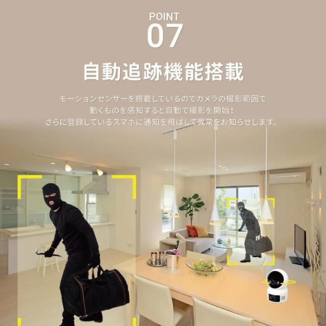 2つのカメラセンサーを搭載しており、左右パンチルトするカメラユニットと正面を固定で広角監視できるカメラの二つを搭載