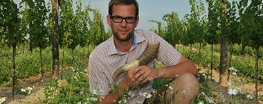 【所有畑は約22ha。自然との共存を考え、農薬や化学肥料は一切使用せず、動物の堆肥や植物を煎じたプレパラシオンという調合剤を使用するビオディナミを取り入れています。畑の土は空気を含み足が沈み込むほどフカフカで微生物たちが生きていることが感じられます。ウサギなどにブドウの葉を食べられないように、畑の周りにウサギが好む植物を育てるなど、まさしく自然と共存したブドウ栽培が行われています。 発酵はすべて自然酵母で、オークの古樽にて行われます。また人工的な温度管理は一切しません。