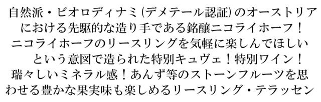 自然派・ビオロディナミ(デメテール認証)のオーストリアにおける先駆的な造り手である銘醸ニコライホーフ!ニコライホーフのリースリングを気軽に楽しんでほしいという意図で造られた特別キュヴェ!特別ワイン! 瑞々しいミネラル感!あんず等のストーンフルーツを思わせる豊かな果実味も楽しめるリースリング・テラッセン