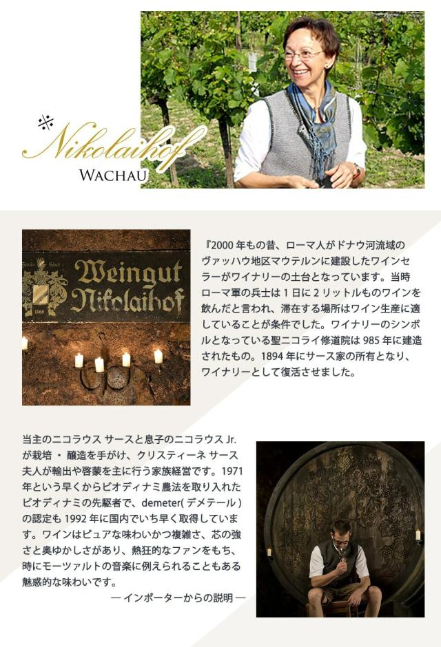 【2000年前にローマ人がドナウ河流域のヴァッハウ地区マウテルンに建設したワインセラーが土台となる歴史ある醸造所。ワイナリーのシンボルとなっている聖ニコライ修道院は985年に建造された物です。1894年にサース家の所有となり、ワイナリーとして復活させました。 当主のニコラウス サース氏と息子のニコラウスJr.氏が栽培・醸造を手がけ、クリスティーネ サース夫人が輸出や啓蒙を担当しています。1971年からビオディナミを取り入れ、1992年にはdemeter(デメテール)の認定を受けています。