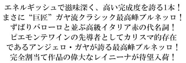 エネルギッシュで滋味深く、高い完成度を誇る1本! まさに“巨匠”ガヤ流クラシック最高峰ブルネッロ! ずばりバローロと並ぶ高級イタリア赤の代名詞! ピエモンテワインの先導者としてカリスマ的存在 であるアンジェロ・ガヤが誇る最高峰ブルネッロ! 完全割当て作品の偉大なレイニーナが待望入荷!