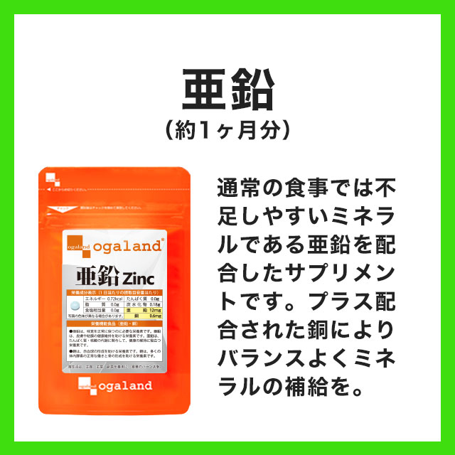 毎日の補給に、1粒あたり12mgの亜鉛を配合し、普段の食事から摂取できるとされるセレンやクロムは配合せず