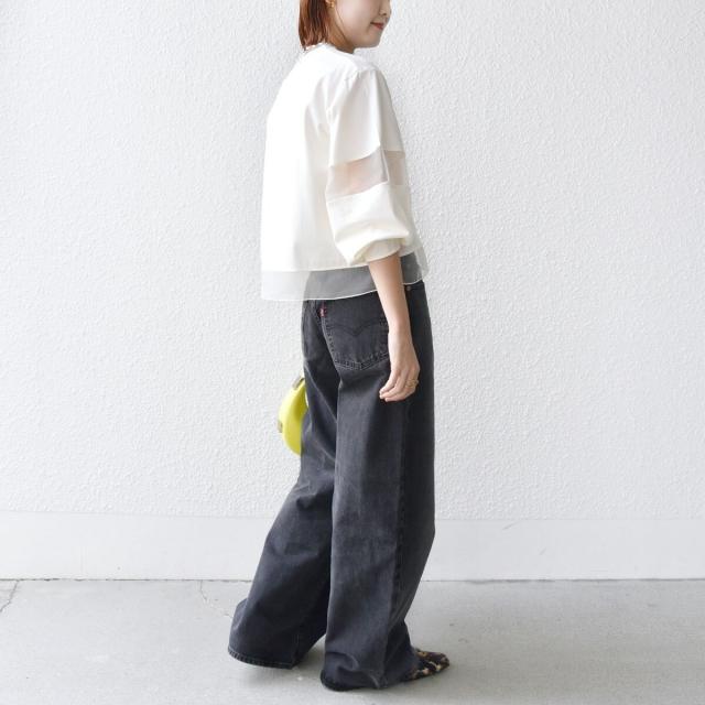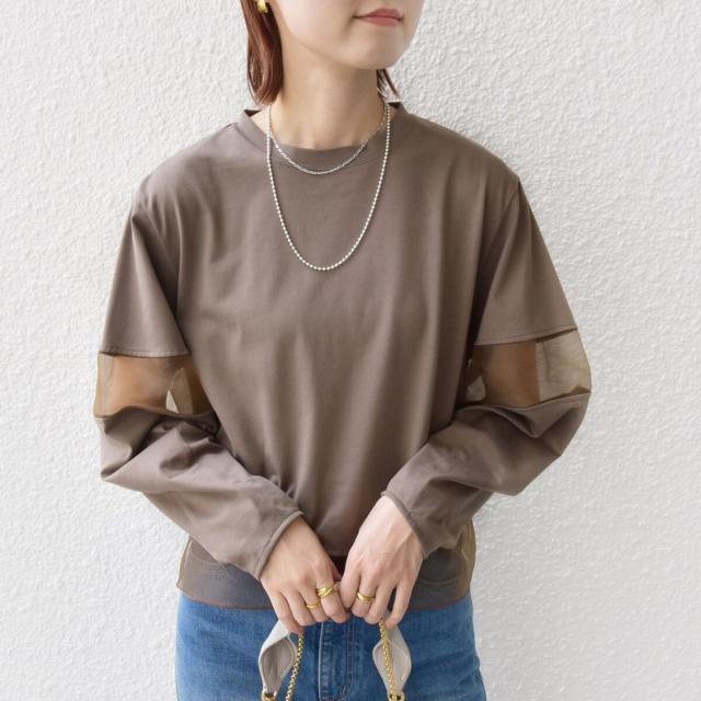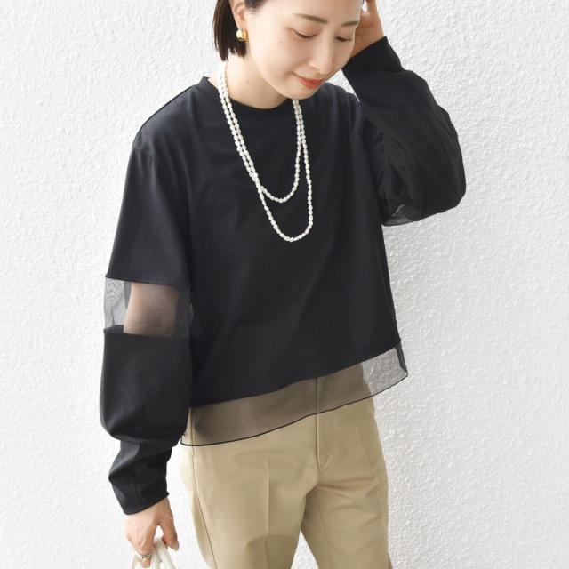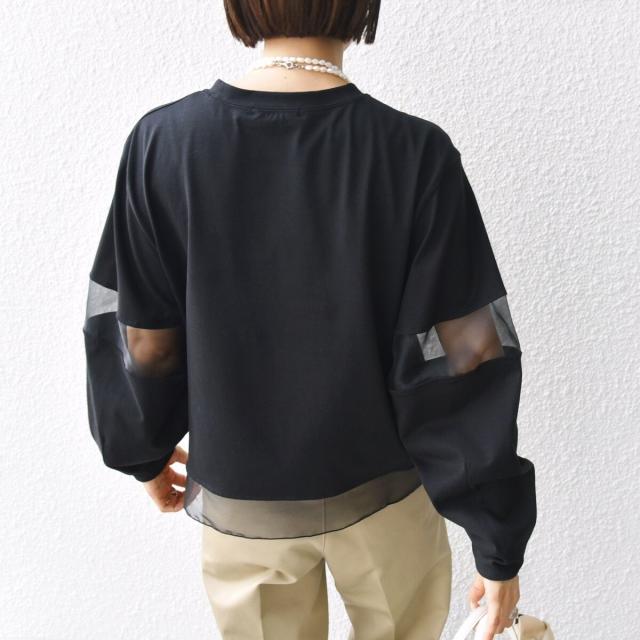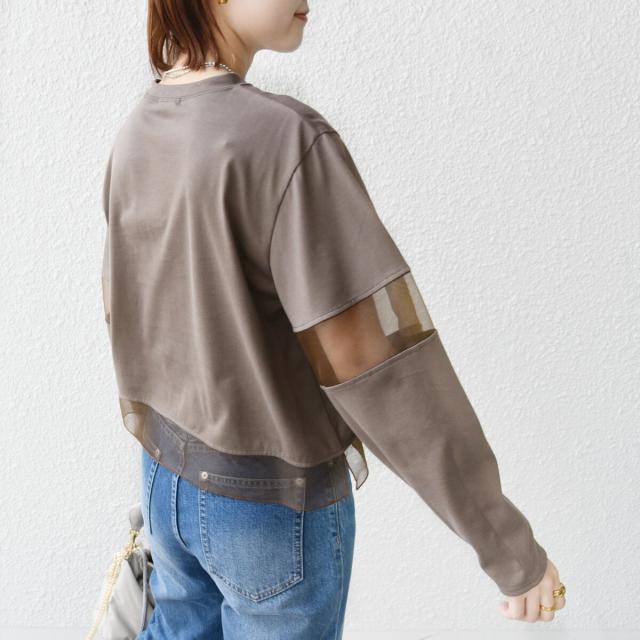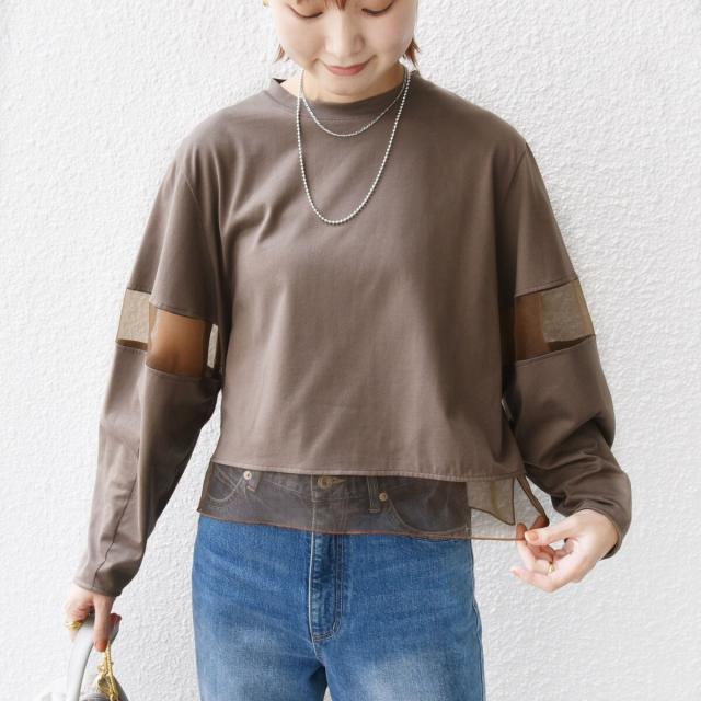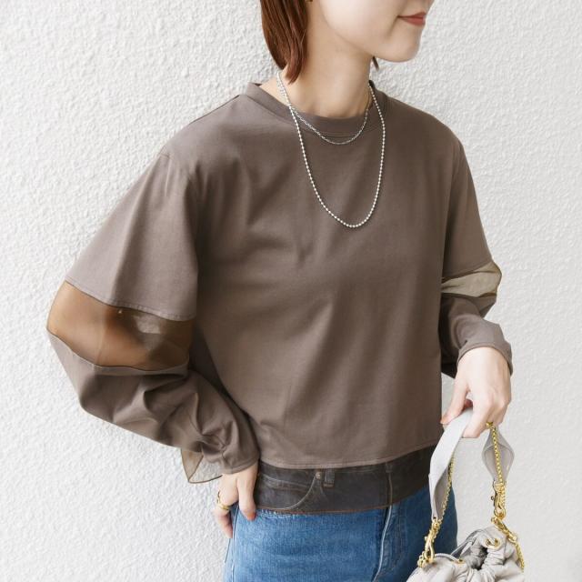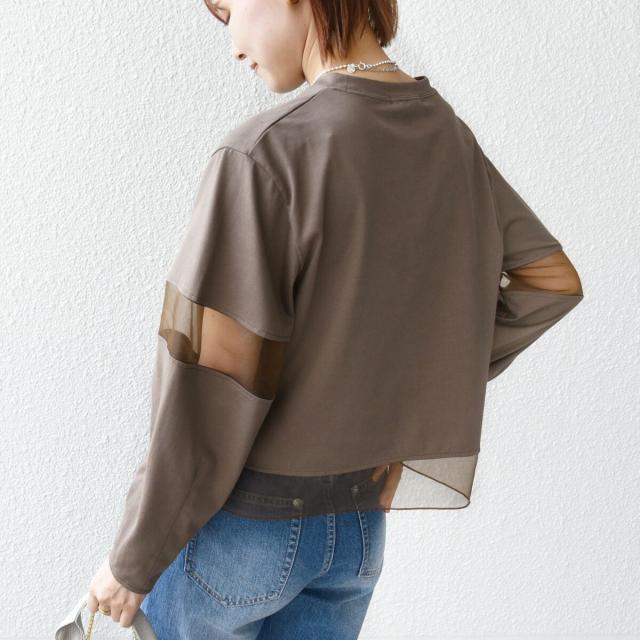 袖と裾に透け感のあるオーガンジー素材を組み合わせた、1枚で決まるトップス。