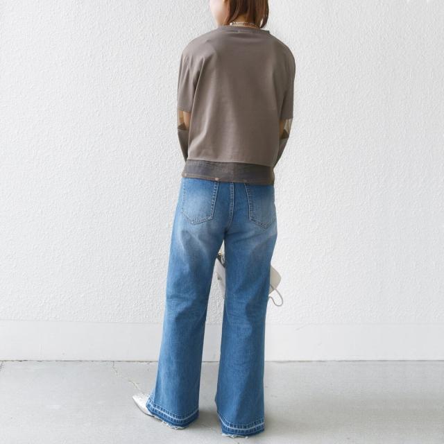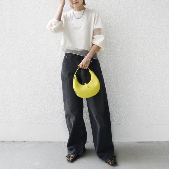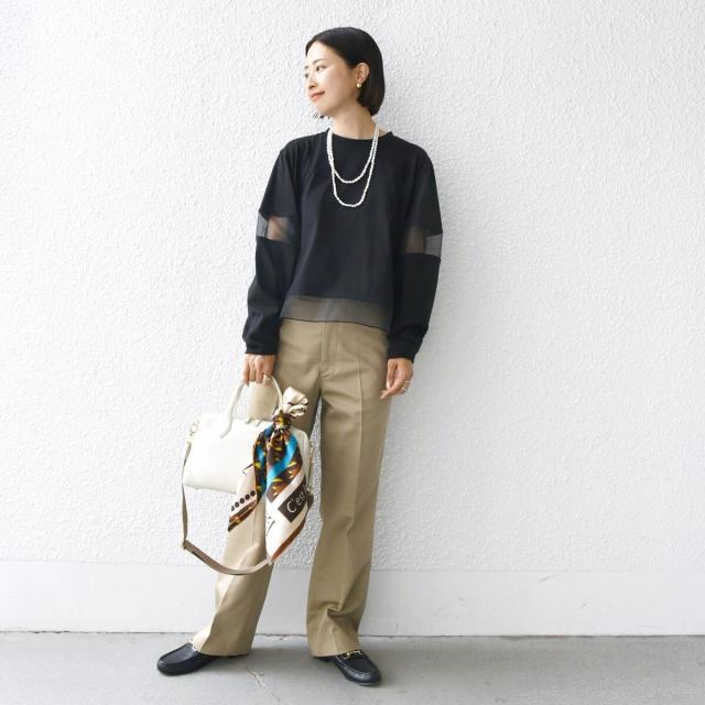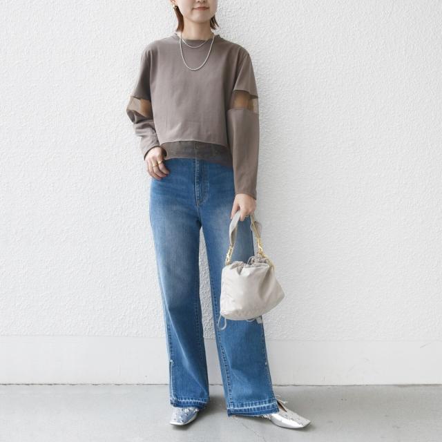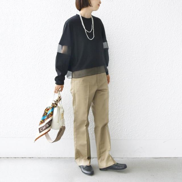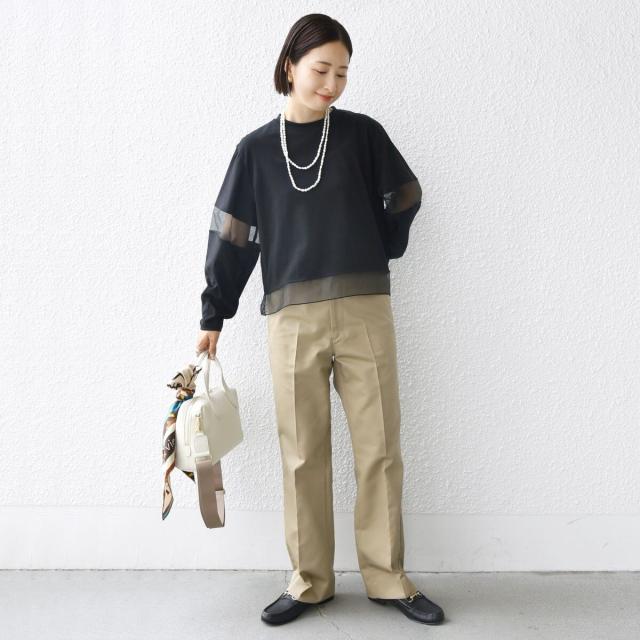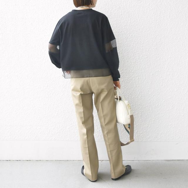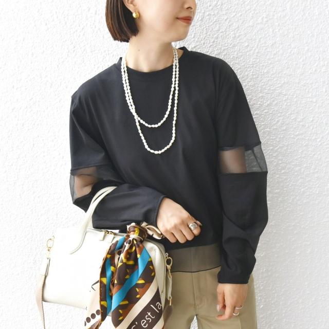 カットソーで着やすさがありながらも、袖のシアーがおしゃれな印象に。