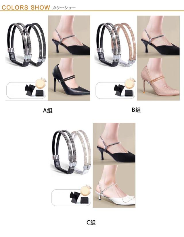 | 使い方色々の2連シューズストラップ。 パンプスのパカパカを防止するシューズバンド、キラキララインストーンでシンプルな靴も華やかに。 引っ掛けるだけで操作簡単! 靴に元からついていたかのような一体感があり、つけ心地バツグン! パンプスはもちろん、ヒールのあるサンダルやミュールにもお使いいただけます! | |