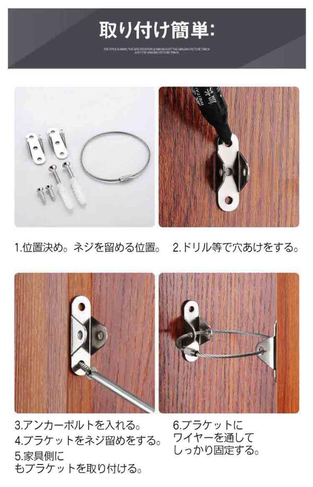 | 家具を固定して安全を守る家具転倒防止ストッパー! 地震による家具の転倒防止対策。家庭の安全に不可欠!DIYが苦手な人でも取り付け簡単。家具と壁に穴を開ければ、取り付け可能。家具の転倒を防止して、家族の安全を守ります。 こちらの金具は大部分の家庭用家具に適しています。本棚スリム、コーナーラック、タンス、突っ張りラック、テレビラック、脚立、大型ラック、食器棚や収納棚など広い場所に使われています。 取り付け簡単:1.位置決め。ネジを留める位置。 2.ドリル等で穴あけをする。 3.アンカーボルトを入れる。 4.ブラケットをネジ留めをする。 5.家具側にもブラケットを取り付ける。 6.ブラケットにワイヤーを通してしっかり固定する。 | |
