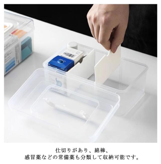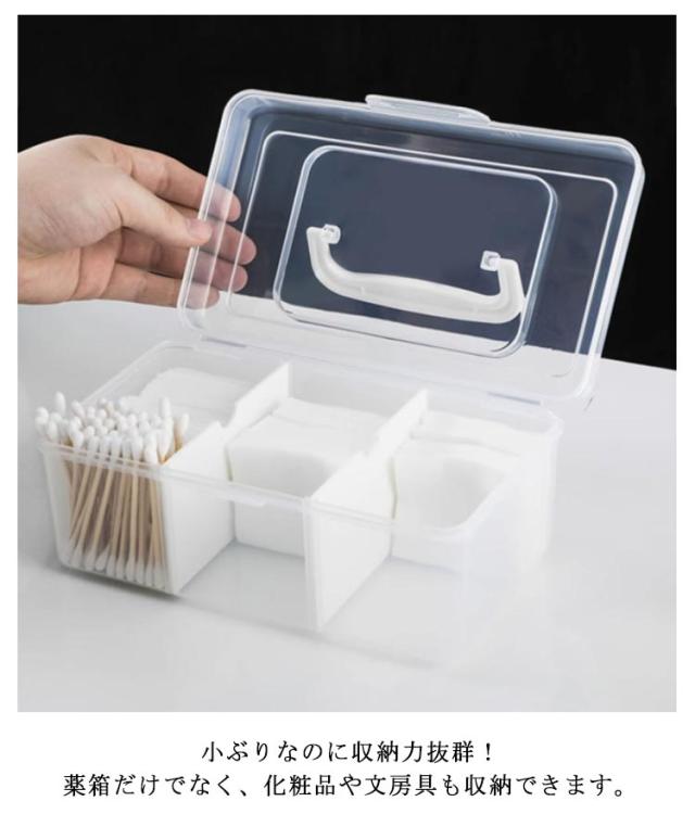 | 家に置いて常備薬をまとめてコンパクトに収納するミニ薬箱。 透明になっているので、中身が一目瞭然です! スクエアタイプなので、小さくて持ち運びやすいです。 仕切りがあり、綿棒、感冒薬などの常備薬も分類して収納可能です。 小ぶりなのに収納力抜群!薬箱だけでなく、化粧品や文房具も収納できます。 持ち手収納時は上部がフラットになるので、棚などに入れる際も持ち手が当たったり、かさばらず省スペースで収納が出来ます! すぐに取り出して使いたい物や、救急箱や衛生用品の収納にオススメです。 | |