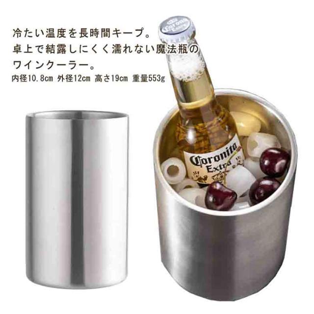 | 冷たい温度を長時間キープ。卓上で結露しにくく濡れない魔法瓶のワインクーラー。 中に置くだけで冷たさが長続き&結露もしません。スタイリッシュかつシンプルなデザイン性も魅力。 ステンレス製&2層断熱構造だから保冷機能が高く、中に置くだけで冷たい状態をキープ! 容器の口部口径は約10.8cmの広口設計なので、ワインやシャンパンの瓶が入れやすくなっています。瓶ビールもOK。 電気を使わず保冷するのでとってもエコ。耐久性に優れたステンレス製で丈夫で長持ちします。 | |