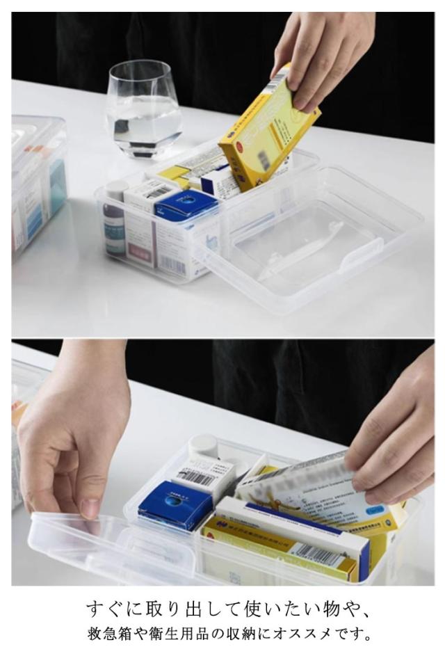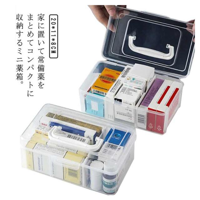 | 家に置いて常備薬をまとめてコンパクトに収納するミニ薬箱。 透明になっているので、中身が一目瞭然です! スクエアタイプなので、小さくて持ち運びやすいです。 仕切りがあり、綿棒、感冒薬などの常備薬も分類して収納可能です。 小ぶりなのに収納力抜群!薬箱だけでなく、化粧品や文房具も収納できます。 持ち手収納時は上部がフラットになるので、棚などに入れる際も持ち手が当たったり、かさばらず省スペースで収納が出来ます! すぐに取り出して使いたい物や、救急箱や衛生用品の収納にオススメです。 | |