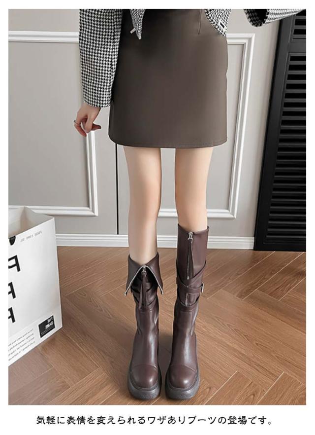 ベルト 5cmヒール ブーツ 折り返し ロングブーツ 痛くない 2way レディース フロントジップブーツ ラウンドトゥ センタージップ 合皮 靴 レディース 歩きやすい 履きやすい ジッパー カジュアル
