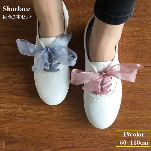 靴紐 靴ひも シューレース 1ペア 平紐 リボン オーガンジー 透け感 シアー 靴アクセサリー 幅広 単色 無地 かわいい おし