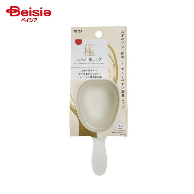 柄が長くてすくいやすく、2kg袋にも入るサイズ。洗いやすい形ですり切りもスムーズ。段差と大きい数字で見やすい目盛り。