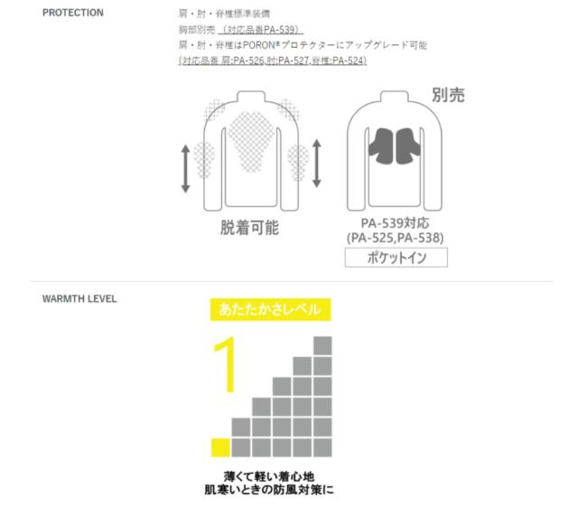 ※モデル写真はイメージです。一部カラーに後脇ベンチレーションと肘プロテクター固定ベルトが付いていないものがありますが、現物は付属します。