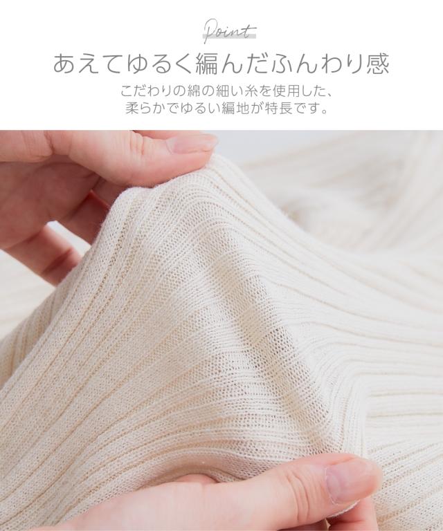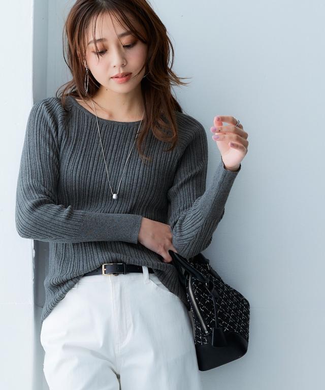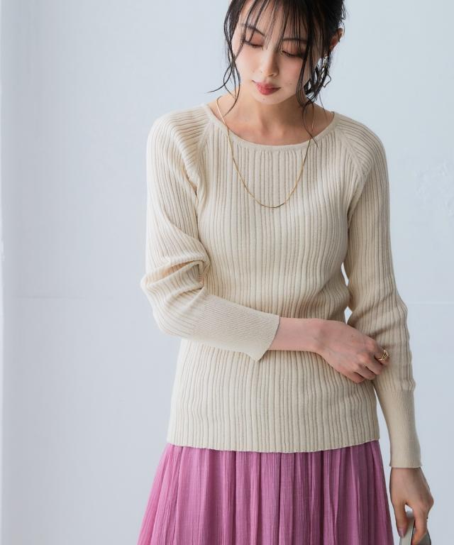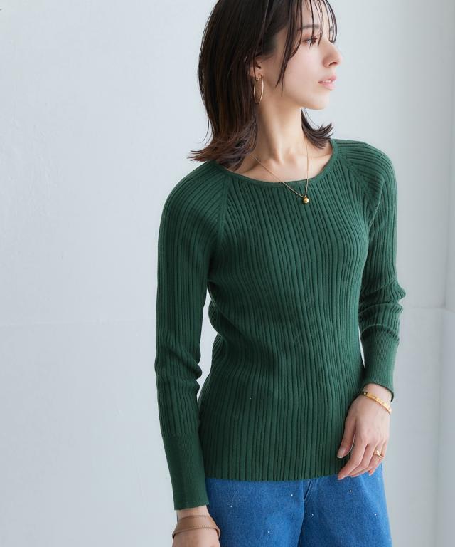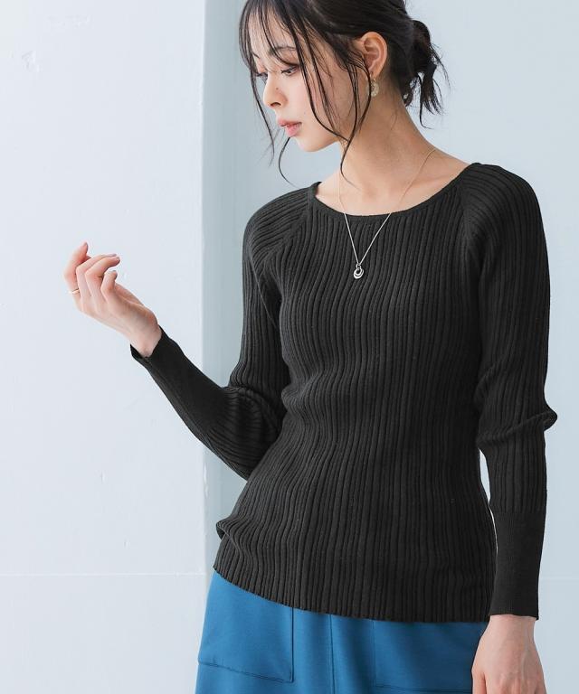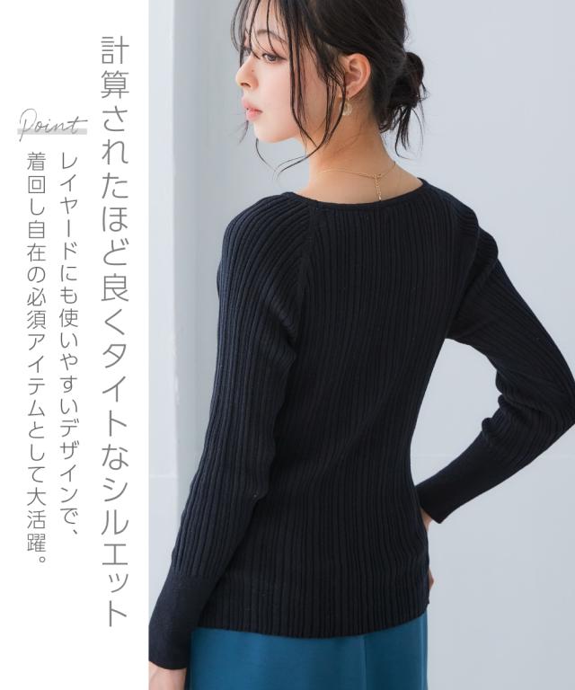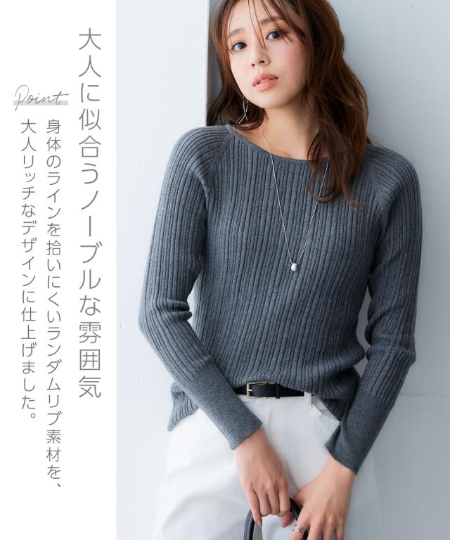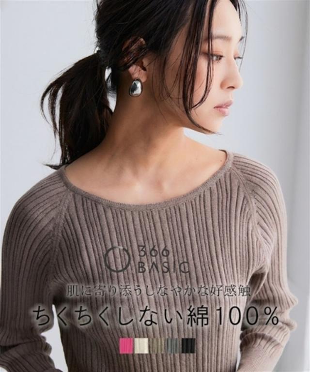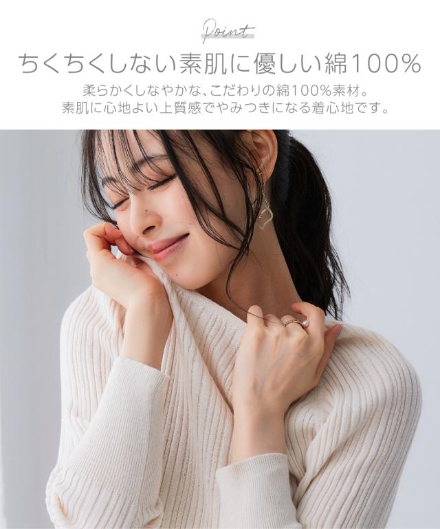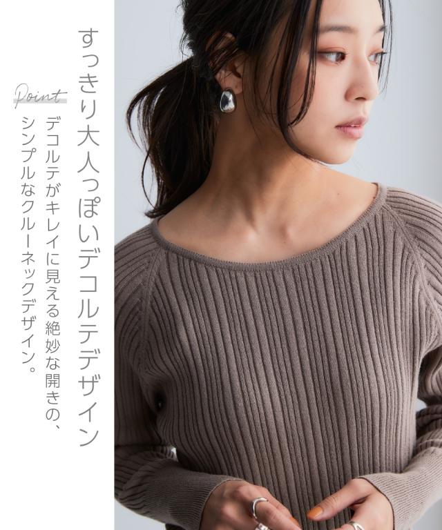 ニットはチクチクする・・もこもこするから重ね着しにくい・・そんな方に是非着ていただきたい!素肌に着てもチクチクしない!着心地にこだわったお肌に優しい綿100%素材。(本体部 綿100%)細い糸で、あえて薄手に編んでいるので、着膨れせずインナー使いにも最適!幅広いシーズンの着こなしに使える優秀リブニットです。■デザイン・デコルテをきれいに見せてくれるやや浅めの開きのクルーネックは、幅広いコーデに合わせやすく、シーズンレスにお使いいただけます。・立体感のあるランダムリブの編地は肉厚を拾いにくく、縦長効果を発揮して細見せを叶えます。・細いリブと太いリブを組み合わせてこだわった編地で、優しい綿の柔らかくしなやかな素材感を保ちながら、大人リッチなデザインに仕上げています。・一見、すごくタイトで細身にみえますが、抜群の伸縮性で、身動きしやすくストレスフリーな着心地です。・袖口は細かいリブになっており、やさしくフィットしてくれます。細かいリブ幅部分を長めに設計しているので、重ね着もしやすく、袖をまくった際にもずれずにしっとりと肌になじみます。■素材・本体部が綿100%だから素肌にも優しく心地よい上質感。・細い糸で、あえて薄手編んでいる