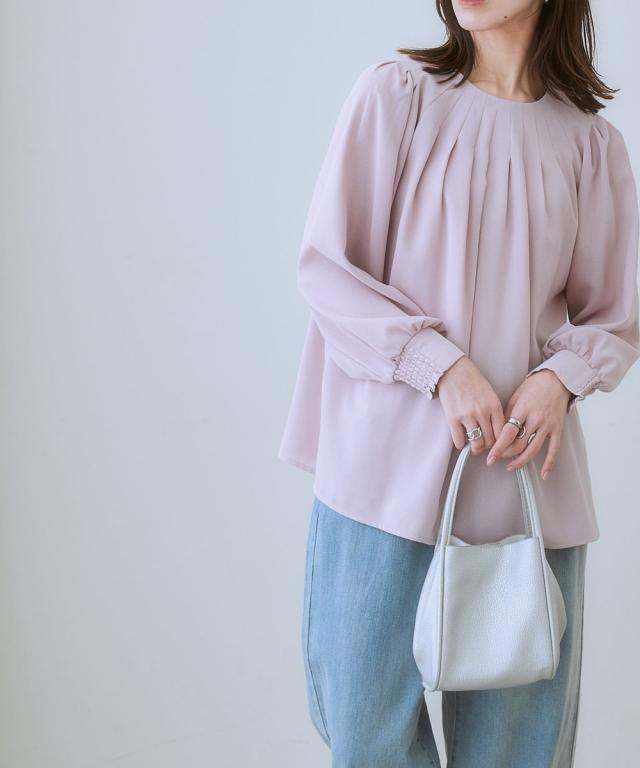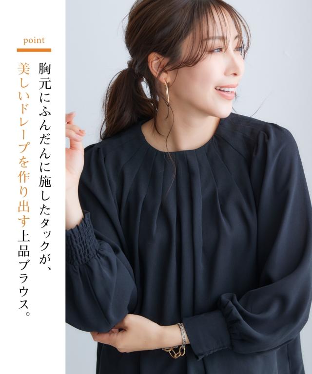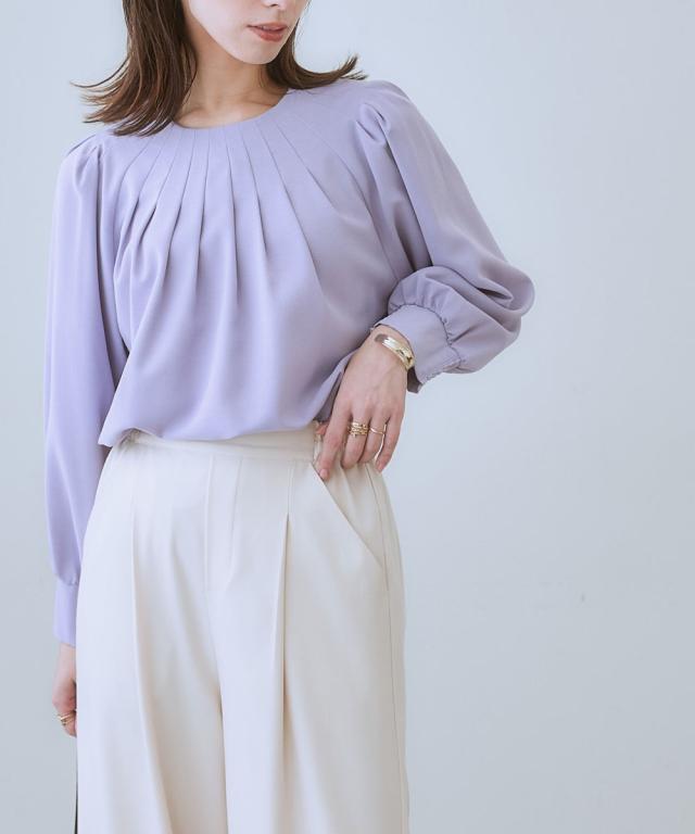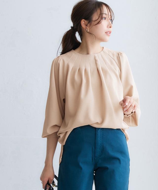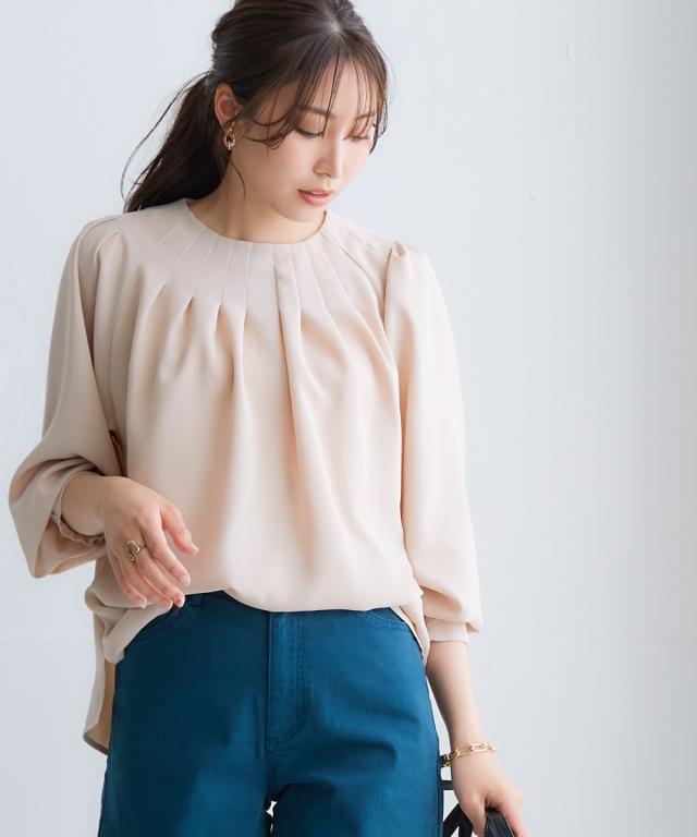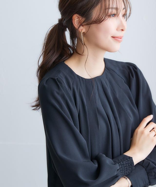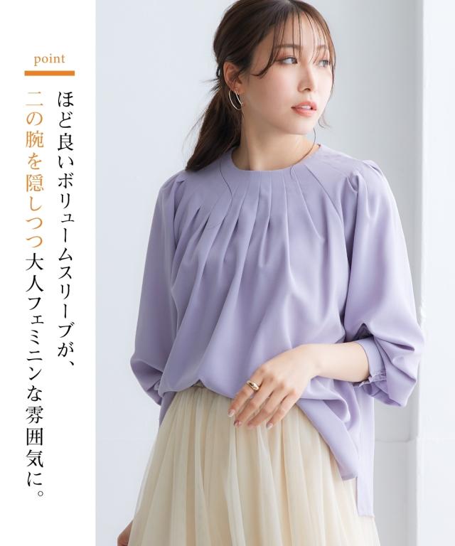 きれいめカジュアルスタイルにぴったりの、ボリュームスリーブタックブラウス。 タック使いで立体感のあるデザインがポイントで、二の腕をカバーしてくれるのも嬉しいポイントです。 さらりとした肌触りの良い素材で、着心地も抜群。 オフィスシーンから普段着まで、幅広いシーンで活躍してくれるアイテムです。 ■デザイン ボリュームスリーブタックブラウスは、タック使いで立体感のあるデザインがポイントのブラウスです。 ふわりとした袖と長めのカフスが二の腕をカバーしてくれるので、気になる方にもぴったりです。 また、すっきりとしたクルーネックで、顔周りをすっきりと見せてくれます。 ■素材 さらりとした肌触りの良い素材を使用しています。 シワになりにくいので、お手入れも簡単です。 ■おすすめのスタイリング ボリュームスリーブタックブラウスは、きれいめカジュアルスタイルにぴったりのアイテムです。 スラックスやスカートと合わせてオフィスシーンに、デニムと合わせて普段着に、と幅広いシーンで活躍してくれます。 また、ジャケットを羽織れば、よりきちんとした印象に。 小物使いで、自分らしいスタイリングを楽しんでください。