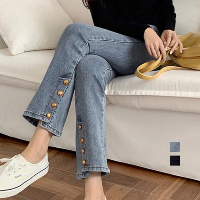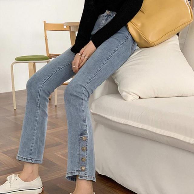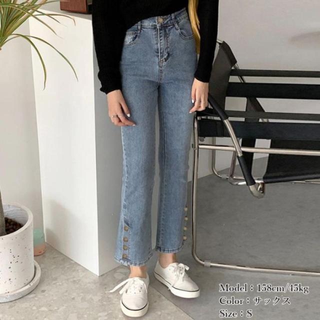 アンクル丈のセミフレアデザインは足首に抜け感をプラスしてくれるスキニーデニムパンツです 両サイドに施したボタンデザインがモダンで遊び心を感じさせる一着