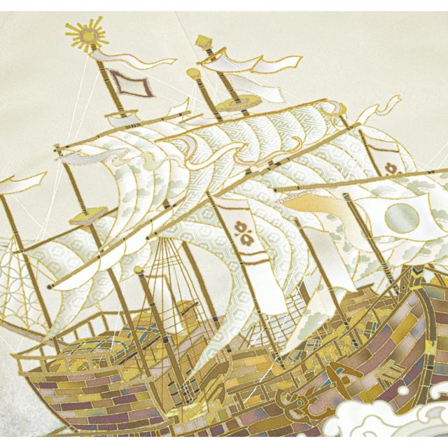 羽織には船や太鼓など雄々しい絵柄が配され、着物はシンプルな無地のデザインです。